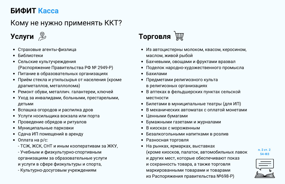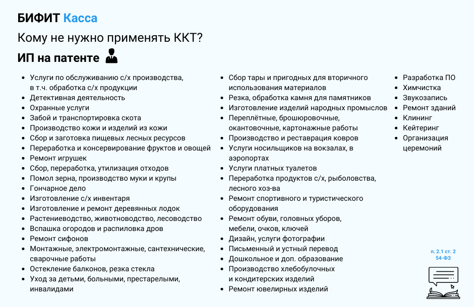 Исключения — некоторые виды деятельности, в том числе на патентной системе налогообложения. С полным перечнем можно ознакомиться в ст. 2 54-Ф Касса не нужна, если ИП получает деньги от организаций или ИП на расчетный счёт в банке. Тут же оговорюсь, что если платит сотрудник организации личной или корпоративной картой, то ККТ необходима. Если компания или ИП получают деньги на счёт от физлица без статуса ИП (например, получает оплату банковскими переводами), такой платёж тоже должен фиксироваться на кассе. Также от применения касс освобождены самозанятые. Им необходимо формировать чеки в приложении «Мой налог». ИП могут перейти с текущего режима налогообложения на самозанятость (т.е. платить налог на профессиональный доход — НПД), если соблюдаются несколько условий: Для чего нужна касса? В первую очередь, для защиты потребителей и ведения белого бизнеса. Кассовый чек — документ, который подтверждает покупку. Он фиксирует, что сделка «купли-продажи» совершена, продавец получил деньги, а покупатель — товар. В кассовых аппаратах есть фискальный накопитель, который записывает, хранит и отправляет в ФНС информацию обо всех оформленных продажах, а также внесении/выдаче наличных и корректировке расчётов. Налоговая получает информацию о том, какой доход получает каждый магазин, ИП или организация. Никто не может скорректировать информацию на носителе, поэтому владельцу бизнеса не удастся занизить доход и заплатить меньше налогов. Кроме того, данные, полученные через ККТ, часто используются для сбора обезличенной статистики и позволяют прогнозировать активность покупателей и спрос на конкретные товары. С помощью программ на ККТ или специальных кассовых приложений на смартфон вы можете: А ведь есть ещё кассовый софт под разные сферы, например, для получения и выдачи заказов. Курьеру достаточно пару кнопок нажать, чтобы пробить чек на заказ. Это очень удобно. — В таком случае касса не нужна. Закон допускает совмещение ИП и самозанятости. Но когда вы принимаете оплату не на расчётный счёт, нужно обязательно пробивать чеки в приложении «Мой налог». — Нет. Во-первых, в большинстве случаев кассовые чеки нужно выдавать покупателю сразу в момент расчёта или отгрузки товара. Во-вторых, кассовый аппарат регистрируется на конкретный адрес осуществления расчётов, вплоть до павильона, кроме случаев, когда касса используется на выезде. Более того, в 54-ФЗ сказано, что ККТ применяется не только для обеспечения интересов граждан и защиты прав потребителей, но и для полного учёта выручки в организациях и у ИП, в том числе для налогообложения и соблюдения правил оборота (ст. 1 п. 2 54-ФЗ). Если вы реализуете товары только онлайн, можно заключить агентский договор с платёжным сервисом. В таком случае, сервис будет принимать оплату на свой расчётный счёт и отправлять чек покупателю, а затем направлять средства на ваш счёт. Однако комиссия за перевод может быть довольно высокой, поэтому при большом потоке клиентов гораздо выгоднее приобрести свой кассовый аппарат или арендовать облачную кассу. — Если у вас отключится Интернет, не переживайте. Фискальный накопитель сохранит все чеки и передаст в ОФД как только сеть появится. Но если данные не уходят в течение 30 дней, накопитель блокируется. Продолжать оформлять продажи через кассу не получится. ФН разблок