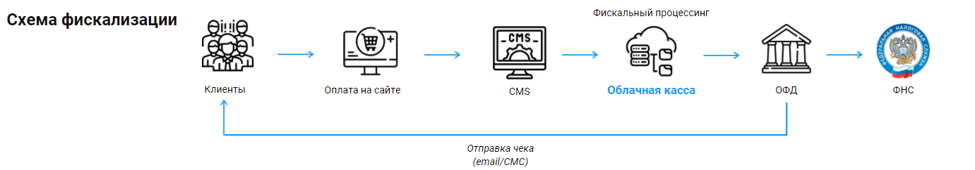 При приёме оплаты на сайте подойдет облачная касса. Для подключения потребуется заключить договор с сервисом, который предоставляет её в аренду. Облачная касса, как и фискальный накопитель, находится у арендодателя в дата-центре. При оплате товаров на сайте автоматически сформируется электронный чек, который будет отправлен покупателю и в налоговую.