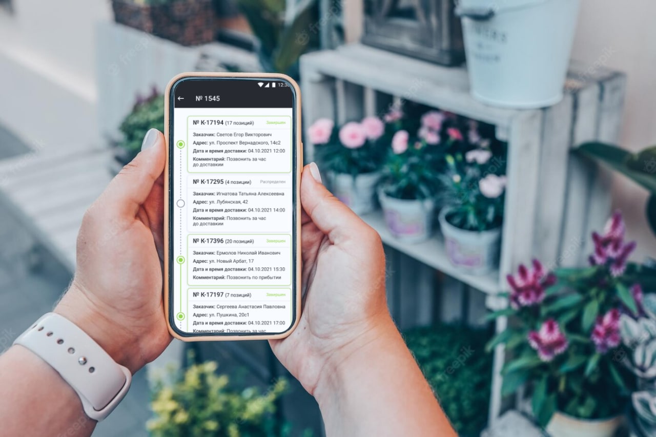 Мобильное приложение подходит тем, кому необходимо управлять собственными курьерами, работать с онлайн-заказами и принимать оплату на выезде. Подробнее о том, как организовать доставку цветочному магазину, читайте на нашем сайте.