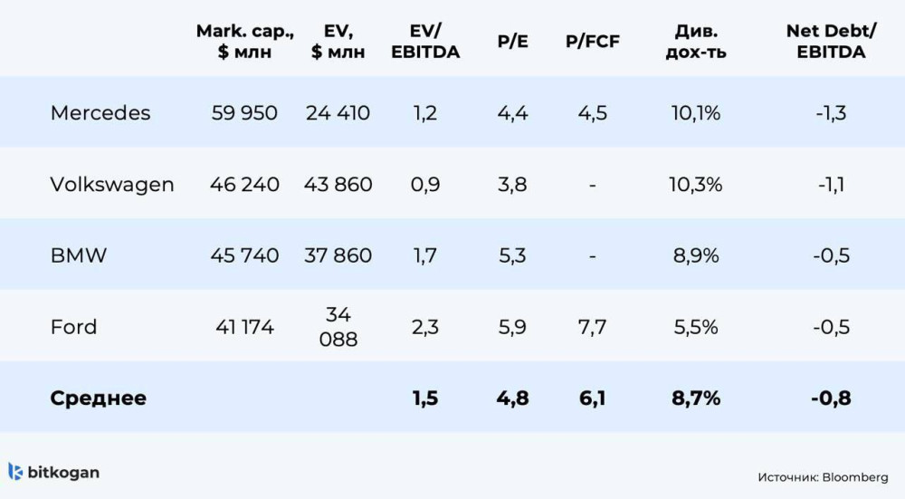 Достаточно любопытный момент — у всех автопроизводителей нет долговой нагрузки (отрицательная Net DEBT/ EBITDA). Т. е. компании предпочитают не использовать займы в банках для вложений в свое развитие.