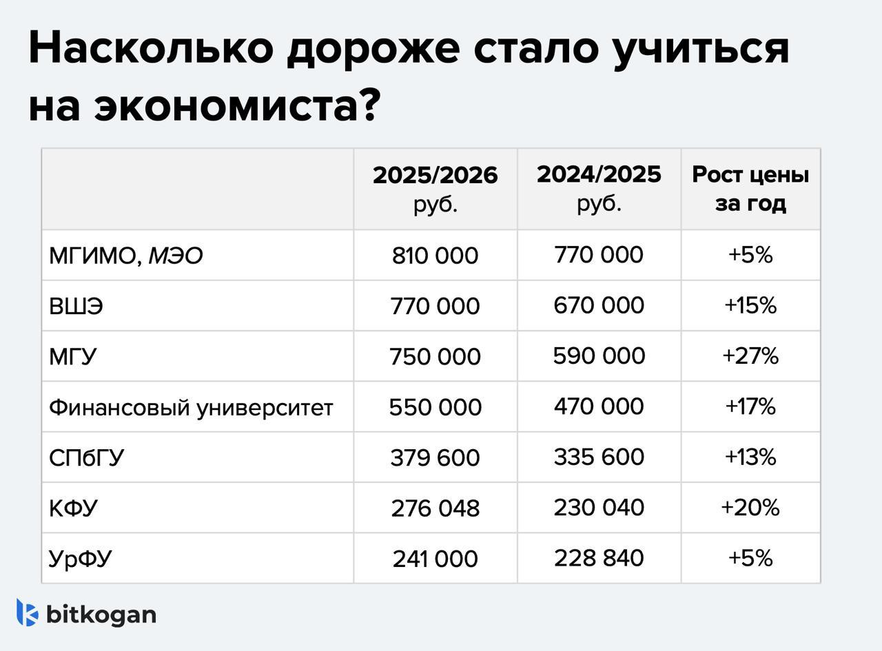 Есть еще одна неочевидная причина. Правительство скоро будет определять, на какие направления давать учебные кредиты под 3% для студентов. Есть риск, что в этом перечне экономических специальностей не будет, потому что в приоритете сейчас инженерные. Вузы заранее опасаются, что желающих учиться на экономиста станет меньше, и поднимают цены.