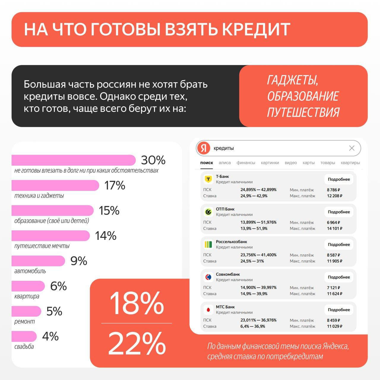 На фоне всего этого меня удивило, что 17% россиян готовы взять кредит на гаджеты, а 14% — на путешествие. При таких-то ставках! По сути, люди соглашаются переплатить 20% за то, что быстро теряет ценность или вообще не имеет остаточной стоимости.