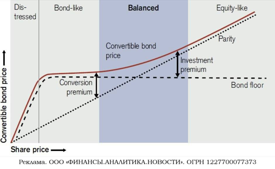 В зависимости от рыночной цены акций котировки на ее конвертируемую облигацию могут вести себя как цена чистого бонда, акции или же нечто среднее.