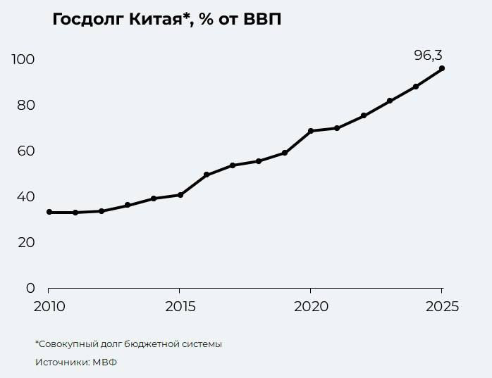 Госдолг Поднебесной вырос с 41% в 2015 году до 96% в 2025-м.
