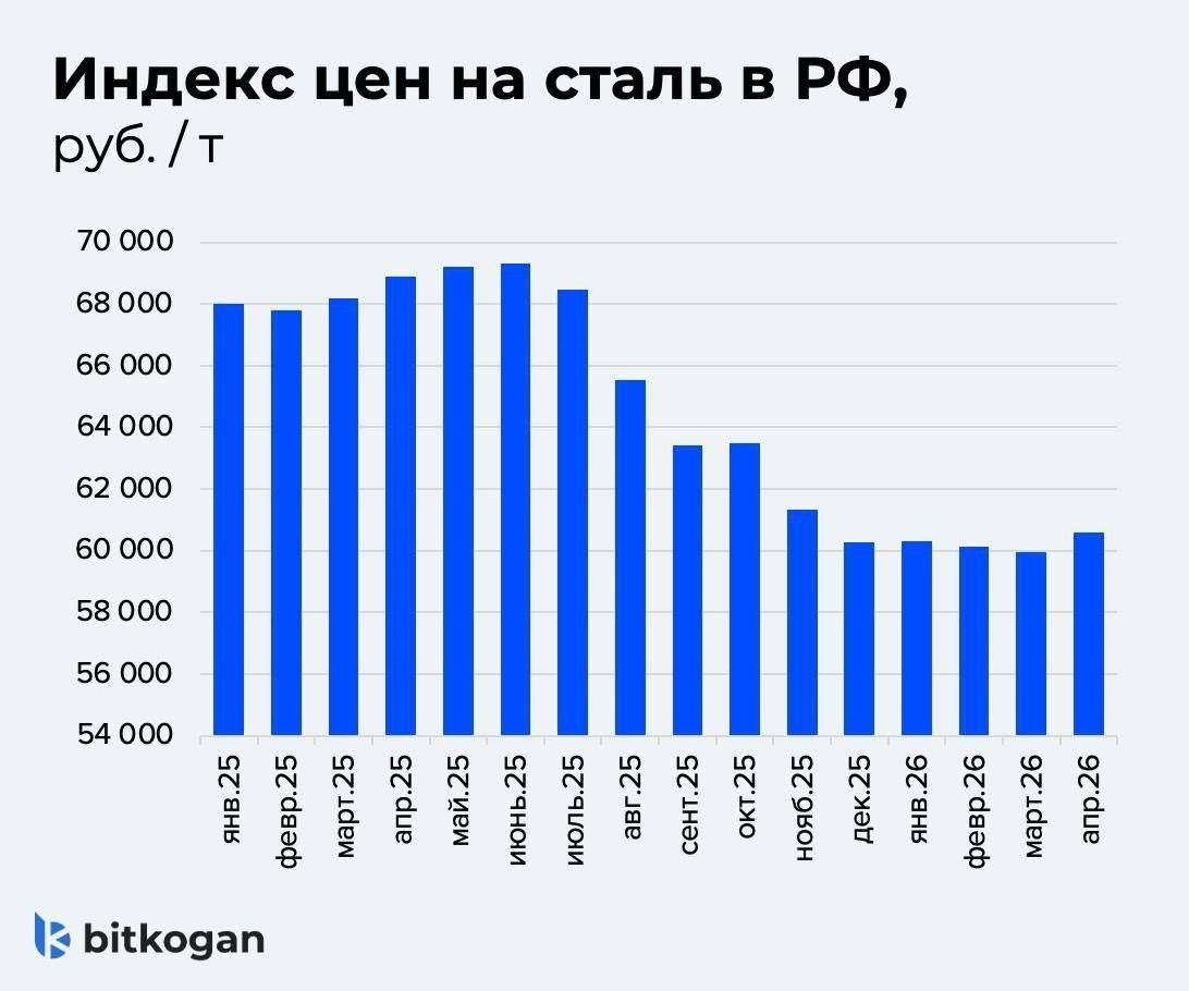 ▪️ Ценовая конъюнктура остается крайне слабой. По данным портала metalinfo.ru, индекс внутренних цен на металлопрокат в апреле снизился на 12% в годовом выражении. Правда, ради справедливости отметим, что в апреле, по сравнению с мартом 2026 года, был отмечен символический рост: целый один процент!