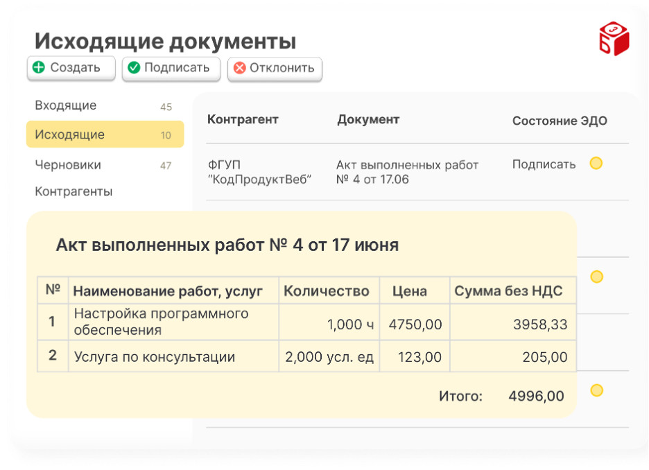ЭДО (электронный документооборот) — это когда вы обмениваетесь документами в интернете через специальные сервисы. Можете в два клика отправить счет клиенту, закрыть работу подрядчика актом или подписать приложение на новые работы.
