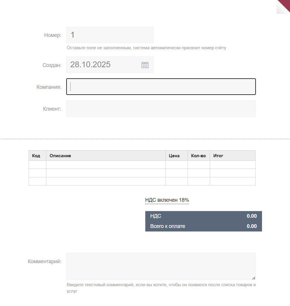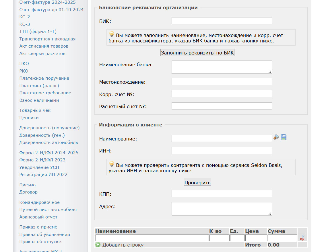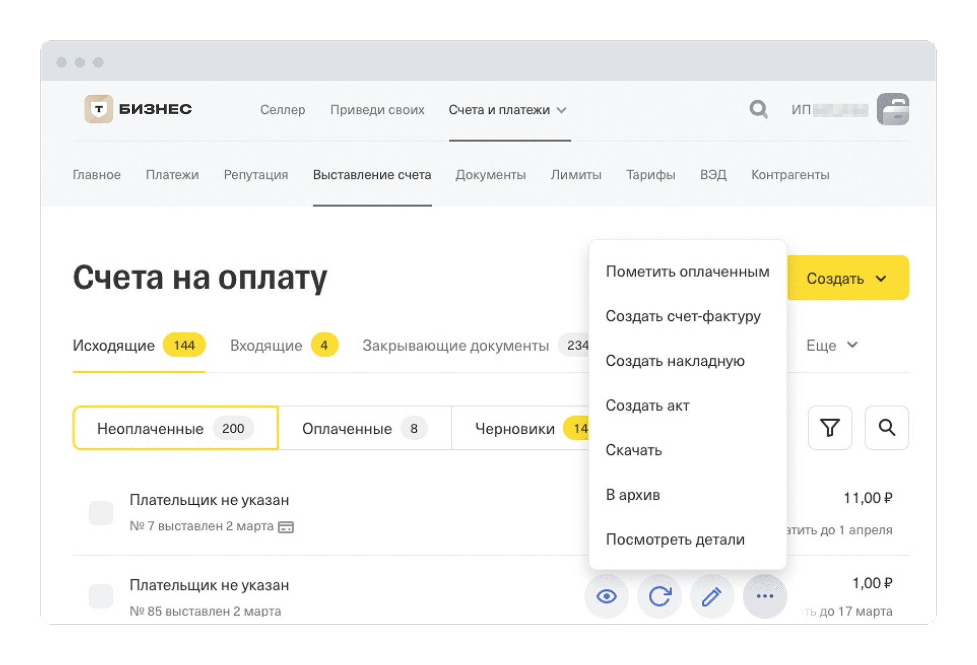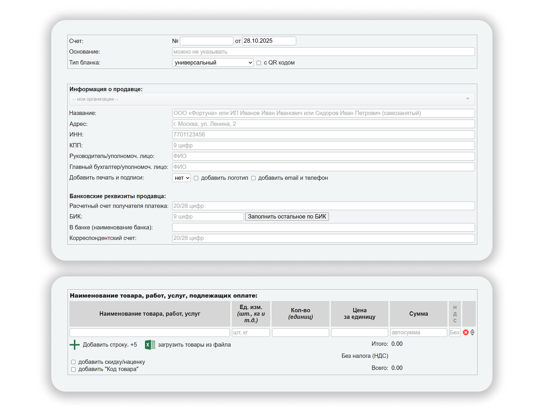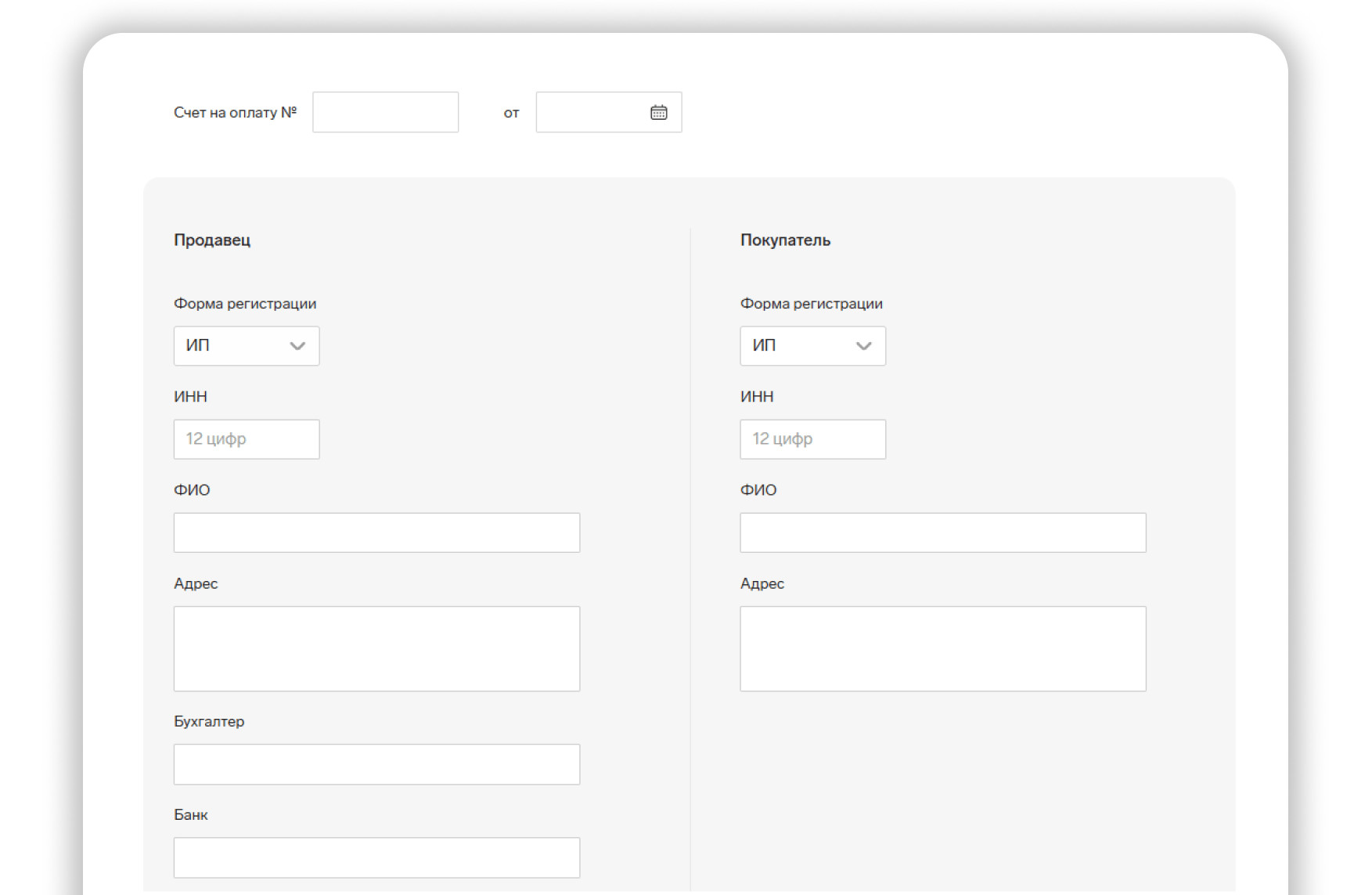 Цена. Бесплатно для ИП и ООО, которые зарегистрировались не более года назад. Также есть бесплатный пробный период на 14 дней. Платный тариф стоит 48 ₽ в месяц при оплате на год. Онлайн-сервис, который позволяет формировать счета без регистрации и установки программ. В нем предприниматель вручную вписывает все данные продавца и покупателя, вносит стоимость и количество товаров или услуг. После этого платформа автоматически формирует файл со счетом, который можно скачать в формате PDF, распечатать или отправить клиенту по электронной почте. Функции. У сервиса есть встроенный калькулятор НДС: он помогает корректно рассчитать сумму налога при разных ставках. Будет полезно тем, кто работает без бухгалтера и хочет избежать ошибок при расчетах. Кому подойдет. Контур удобен, если нужно быстро выставить несколько счетов и нет времени регистрироваться в сервисах или скачивать программы. Будет полезно индивидуальным предпринимателям и фрилансерам, которые формируют лишь два-три документа в месяц. Но сервис не подойдет, если счетов много и заполнять их все вручную слишком долго. Стоимость. Бесплатно, ограничений по количеству счетов нет. Онлайн-платформа для выставления счетов и формирования других бухгалтерских документов. Она умеет автоматически подставлять реквизиты компаний по ИНН и данные банков по БИК. Готовый счет получится скачать в форматах Word или Excel, также можно добавить QR-код для оплаты. Функции. В Serivce-online предприниматель может загрузить список товаров или услуг из Excel, а система сама рассчитает итоговую сумму и НДС. Также получится сохранять собственные шаблоны организаций и контрагентов, чтобы не заполнять их заново каждый раз. Помимо счетов на сайте доступны готовые формы, около 60 разных документов: акты, накладные, договоры и не только. Кому подойдет. Service-online подойдет компаниям, которые часто оформляют типовые документы: торговым точкам, небольшим интернет-магазинам, фрилансерам и сервисным бизнесам. Автозаполнение и шаблоны сэкономят время при работе с постоянными клиентами. Но сервиса не хватит, если нужен полный финансовый учет. Стоимость. Бесплатно, но для некоторых функций нужно зарегистрироваться. Например, чтобы сохранять шаблоны с данными контрагентов. Сервис выставления счетов на оплату, учета и контроля счетов и оплат. В нем предприниматель заполняет реквизиты вручную, автозаполнения нет. Зато все введенные данные сохраняются: когда понадобится сформировать счет в следующий раз, то нужно просто выбрать контрагента из списка. Функции. Главная особенность сервиса — он может автоматически выставлять счета по расписанию. Например, для ежемесячных услуг. Также Транзаптор присваивает каждому счету уникальный номер и сохраняет историю операций, это поможет избежать дублей. Сервис рассчитывает НДС, в нем можно добавлять логотип и печать, чтобы они автоматически подставлялись во все документы. Кому подойдет. Предпринимателям и небольшим компаниям, которые работают с постоянными клиентами и абонентскими платежами. Транзаптор поможет регулярно выставлять счета по нужному расписанию и будет хранить их историю. Стоимость. Сервис бесплатный, но часть функций доступна только после регистрации. Например, добавление в счет подписи или печати. Сервис выставления счетов для владельцев расчетных счетов в Т-Банке.