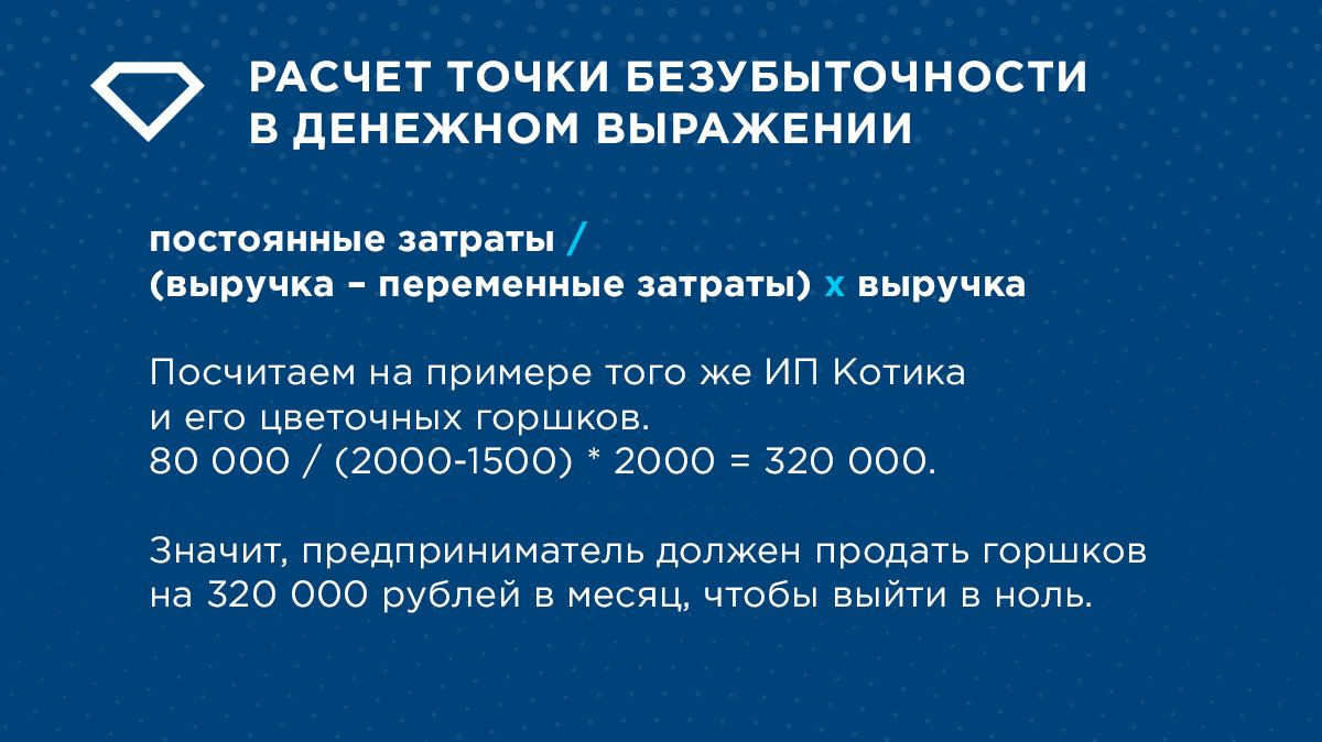 — в денежном выражении: на какую сумму нам надо продать товары, чтобы покрыть затраты