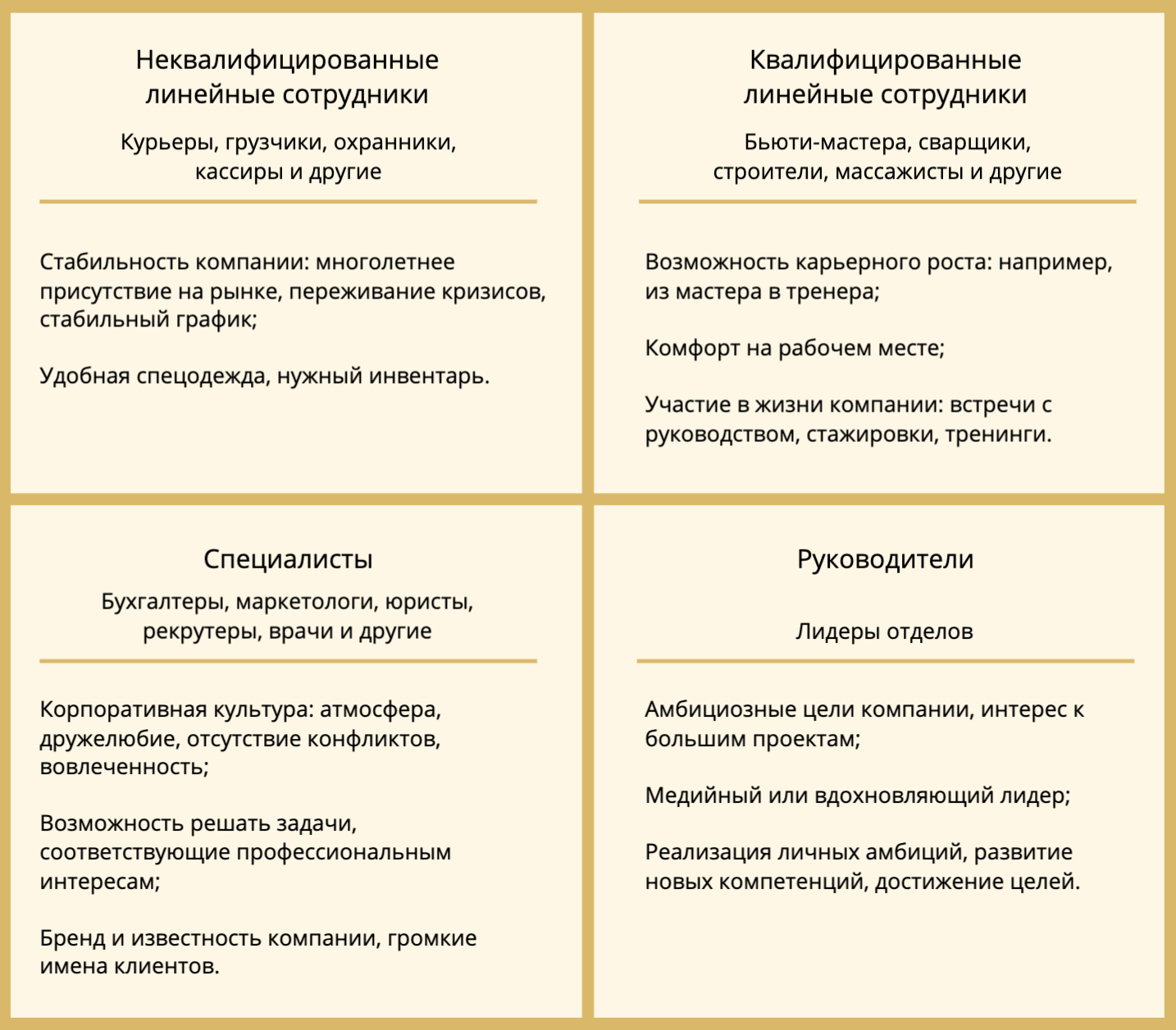 Чтобы понять, как мотивировать вашу команду, сначала стоит разобраться в категориях сотрудников и что важно для каждой из них: Регулярная выплата зарплаты и комфорт на рабочем месте важны для всех категорий персонала, поэтому не стали выписывать их каждый раз. Ясные и достижимые цели Если задача поставлена четко и понятно, человеку гораздо легче начать и выполнить ее. Можно использовать технику SMART — простой и эффективный способ формулирования задач. У сотрудника должно быть понимание конечного продукта и шагов для выполнения задачи. Адекватные условия труда Если это офис, он не должен быть холодным, если производство, нужен весь необходимый инструмент. Зарплата должна быть предсказуемой и стабильной. А если вдруг случаются переработки, они должны оплачиваться в полной мере — work-life balance важен для всех без исключения. Уважение Признательность за качественную работу многое значит. Человеку нужно чувствовать себя важной частью команды, а не очередным «винтиком в системе». Отношения, построенные на страхе, живут недолго — сотрудники должны общаться с учетом субординации, но никак не бояться своего начальства. Возможности для роста Очень мало людей, которые всю жизнь хотят работать на одной должности. Большая часть ваших сотрудников мечтает стать лучше. Если мешать человеку профессионально расти, это только подстегнет его уйти. Позвольте сотрудникам развиваться, разрешите брать более сложные задачи, когда их навыков будет достаточно. Так гораздо выше шанс, что человек сам захочет расти именно внутри вашей компании. Обратная связь Самый простой и надежный способ понимать, все ли хорошо в межличностном общении между вашими сотрудниками. Если что-то не так, вы сможете быстро отреагировать на проблему, которая еще не успела укрепиться. Самый популярный фактор демотивации, который включает в себя отсутствие поддержки, несправедливое или агрессивное отношение, публичное обвинение в ошибках. Руководитель — это лидер. Если даже он не на стороне своей команды, сотрудникам приходится «уходить в оборону». О какой мотивации речь? Другой аспект — безразличие. Если сейчас у компании подход: «Мы увольняем всех подряд, за углом все равно стоит куча кандидатов», то через какое-то время собственники будут делать все, лишь бы сохранить людей. Давать зарплату в три раза больше, обещать лучшие корпоративы, карьерный рост и так далее. Но это не сработает. Избыточный контроль снижает инициативу сотрудников и вызывает недовольство. Если вы наняли специалиста для работы — просто дайте ему работать. Если что-то не нравится, укажите на это и дайте человеку самому исправить ошибку. Когда нет ясных задач, будет неопределенность: сотрудники просто не поймут цели своей работы и что конкретно от них требуется. Соответственно, не выполнят задачу качественно. Слишком много задач или их несоответствие компетенциям быстро приведут к перегрузке. Уставший сотрудник не бывает эффективным. Если человек долго выполняет одни и те же функции, скорее всего, ему это надоест. Поэтому важно учитывать рост каждого сотрудника, давать ему возможность становиться лучше. Непрозрачная система оплаты или нарушение договоренностей по зарплате — например, изменение сроков выплат или невыплата премий сильно подрывают доверие к руководству и желание работать для развит