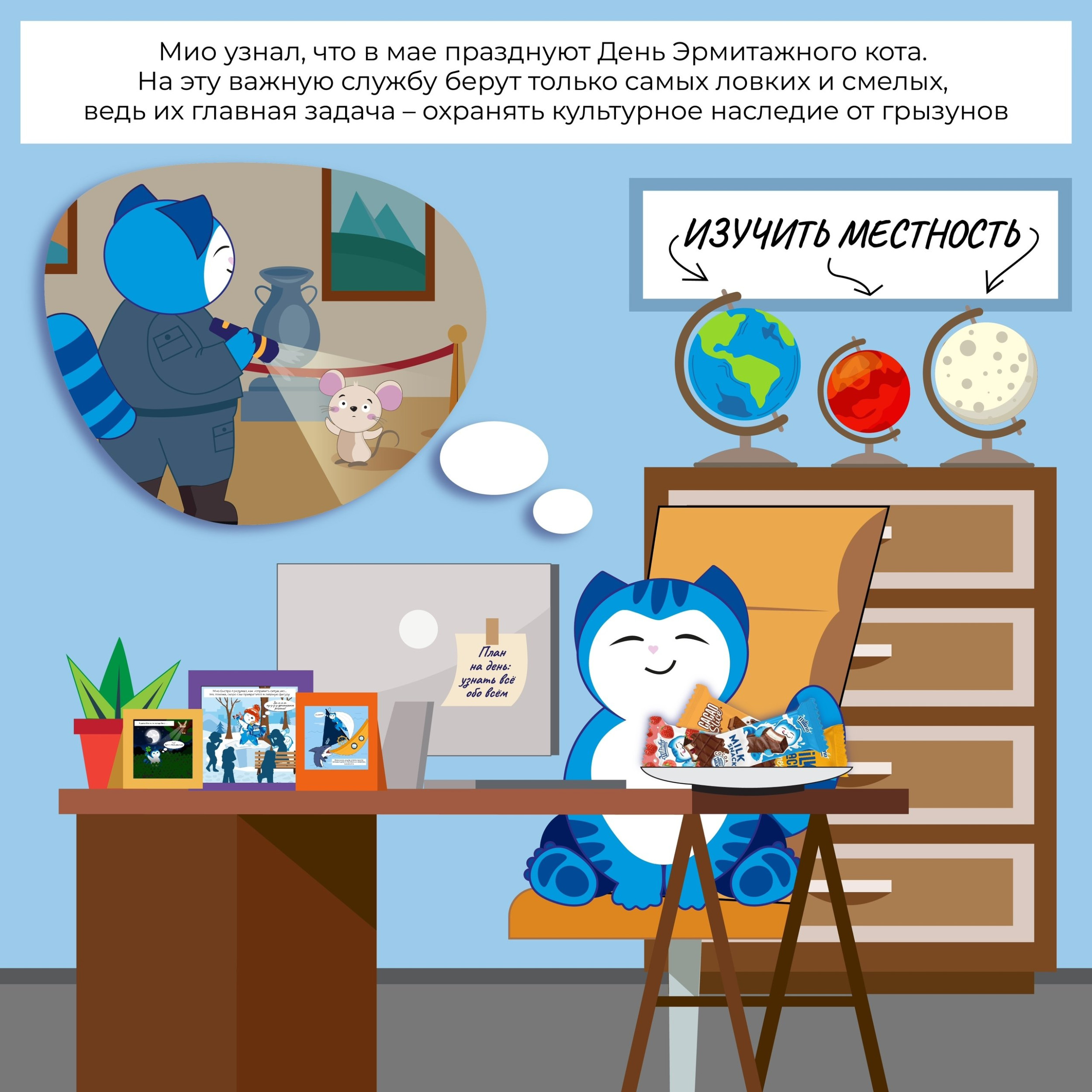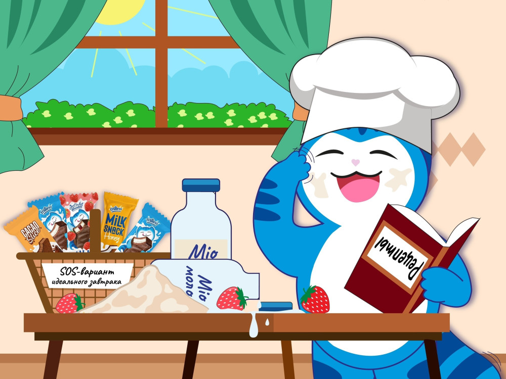 Создание образа Мио стало отдельным творческим вызовом: у нас был лишь базовый визуал на упаковке и несколько референсов от клиента. Мы детально проработали его характер, повадки, эмоции, стиль общения и темы, которые ему близки. Благодаря этому Мио перестал быть просто иллюстрацией на упаковке и стал «живым» персонажем, который вдохновляет, поддерживает и напоминает о маленьких радостях жизни.