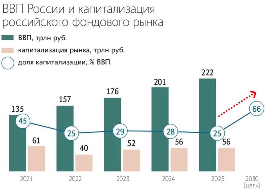 Простой органический рост по инерции, исходя плюс-минус из текущих темпов, даст за 5 лет навскидку ₽30 трлн. А нужно 175. Даже если на IPO дружно выйдет весь крупняк вроде Дом РФ, Сибура, РХСБ, Avito, WB, не говоря уже про таких монстров как РЖД или Росатом, это даст не более ₽20-30 трлн. И это если продадут норм пакет, а не 2%. Значит, для выполнения поставленной задачи нужны гормоны посильнее. На мой взгляд, ими могут стать: Нормализация геополитики. Без этого все усилия будут тщетны, поскольку повышенные бюджетные расходы будут разгонять инфляцию, а гражданские сектора (именно они в основном торгуются на бирже) не вылезут из стагнации, т.к. ставка останется высокой. Пресловутое доверие, о котором много говорят, особенно когда случается очередной «ЮГК». К доверию прилагаются: обязательное раскрытие отчетности, судебная защита прав миноритариев, система страхования инвестиций. Без нерезидентов, достаточно ликвидности никогда не будет. Да, их разблокировка (даже постепенная) сначала приведёт к просадке, но при наличии взаимного доверия, вернутся. Реально большие деньги во всем мире — пенсионные. Без инвестиций НПФ, фондовый рынок не вырастет так, как с ними. Такая вот у меня получилась картинка, со стрелочкой вверх. Если вам близок, или хотя бы понятен такой взгляд — ваши реакции под постом будут мне хорошей мотивацией!