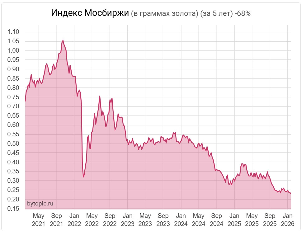 Вся эта вакханалия явно не обошлась без опьяняющего эффекта FOMO. Блеск металла ослепляет, а на график индекса Мосбиржи в граммах золота лучше не смотреть, не перевернув его вверх ногами.