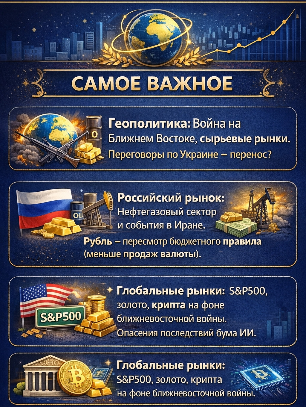ТГК-1 (#TGKA) — отчет по МСФО за 2025г (РСБУ не раскрывали). За чем следить на этой неделе Геополитика. Война на Ближнем Востоке и сырьевые рынки, риски полного перекрытия Ормузского пролива. Трехсторонние переговоры по Украине в Абу-Даби — ожидались 4-5 марта — перенос. Круглый стол с участием Лаврова — 5 марта. Санкции. Давление ЕС на Орбана, блокирующего принятие 20-го пакета (включает запрет на морскую транспортировку нефти). Российский рынок. Нефть и газ на фоне событий в Иране, дисконты на российскую Urals. Котировки акций нефтегазового сектора. Недельная инфляция — 4 марта 19:00мск. Рубль в ожидании пересмотра бюджетного правила (меньше продаж валюты). Глобальные рынки. S&P500, золото, крипта на фоне событий в Иране. Коррекция в техсекторе: опасения последствий бума ИИ. Рынок труда в США (февраль) — 5 марта 16:30мск. Всех с началом весны, успешной и продуктивной недели!