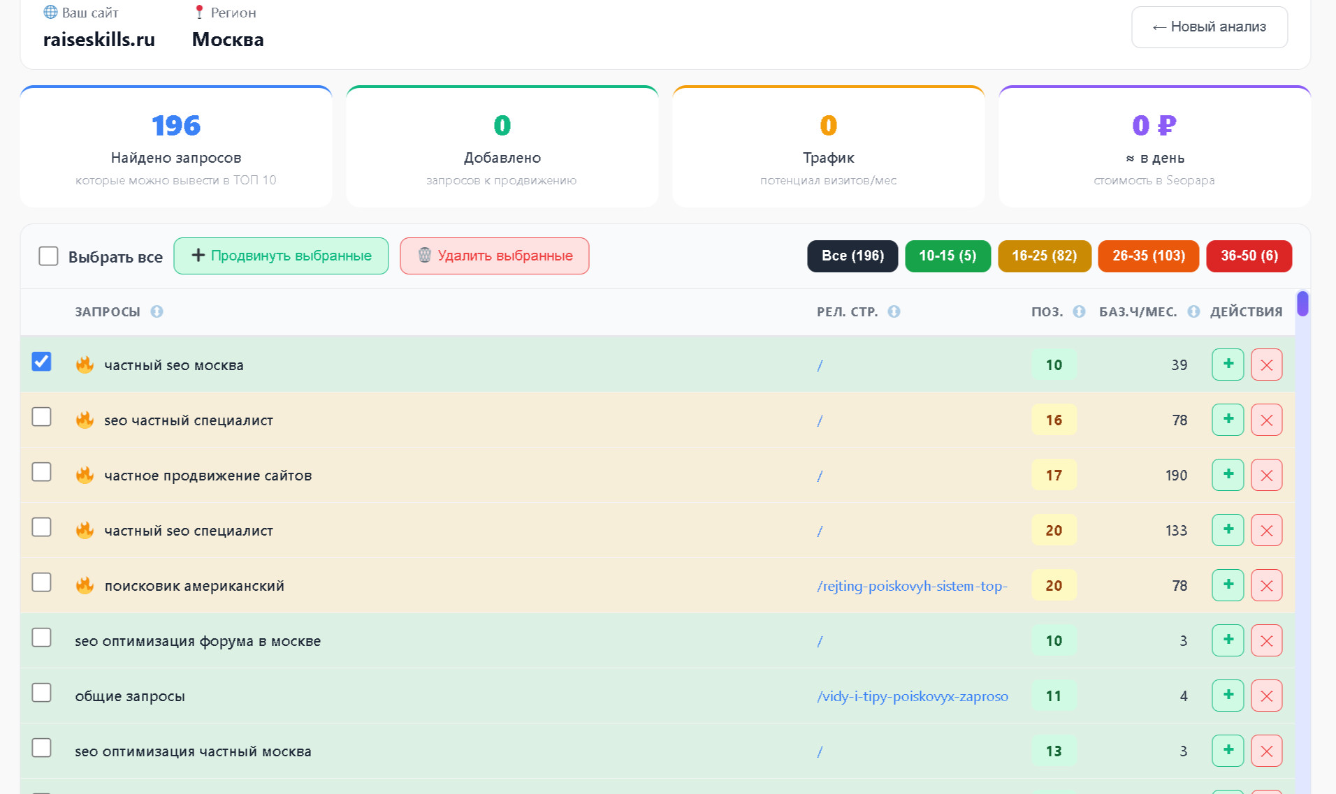 - Action (Автозапуск). Пользователь отмечает нужные запросы, жмет кнопку, и данные улетают по API в сервисы продвижения (для накрутки ПФ и закупки ссылок).