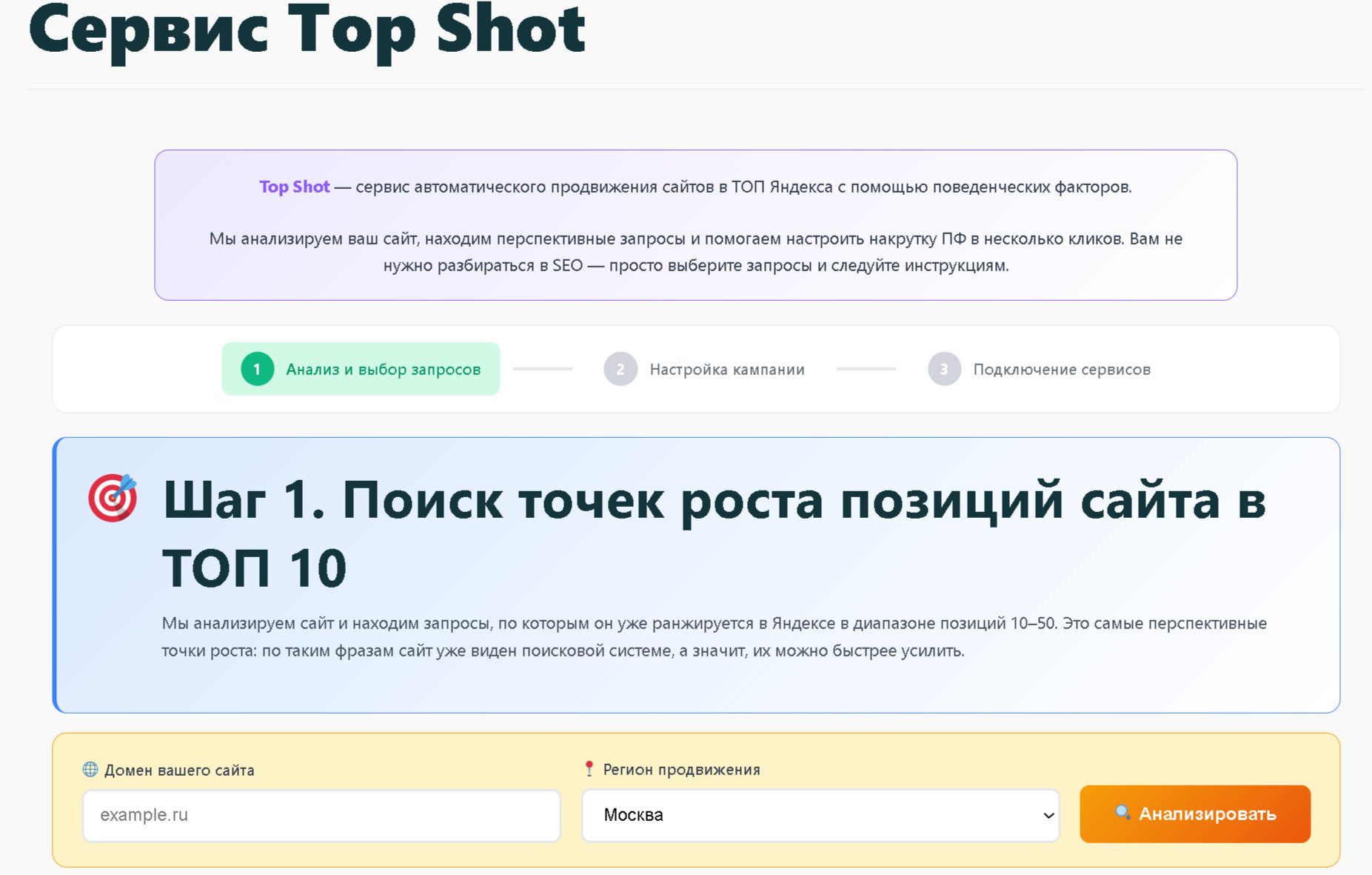 Первые два шага собрались отлично. Интерфейс получился минималистичным: вбиваешь домен и через секунду получаешь готовый план действий. Без Excel, без формул, в два клика. А вот на третьем шаге (Автозапуск) меня ждало разочарование. Оказалось, что нужные мне инструменты — сервисы Seopapa и Спиральный Бустер — не имеют открытого публичного API для управления кампаниями и бюджетами. Создать полностью автоматический конвейер оказалось невозможно. Для стартапа это классический момент: либо закрывать проект, либо делать пивот (разворот). Раз я не могу программно запускать продвижение, я решил оставить TopShot на этапе удобной бесплатной диагностики, а инструменты для «дожима» запросов передать пользователям прямо в руки. Теперь сервис работает так: вы сканируете сайт, находите свои зависшие запросы, а система на финальном шаге выдает вам солидные промокоды на старт (до 18 000 рублей) для самостоятельного запуска кампаний в этих сервисах. Вы получаете бесплатный аудит и бонусный бюджет, а я — реферальные отчисления на поддержку серверов. Инструмент открыт и работает здесь: Сервис TopShot Для предпринимателей и маркетологов это возможность за 1 минуту узнать, какие страницы прямо сейчас находятся в шаге от ТОП-10 Яндекса, и понять, куда выгоднее всего вложить маркетинговый бюджет. Буду рад, если вы потестируете сервис на своих проектах и напишете честный фидбек в комментариях. Насколько вообще полезен такой формат экспресс-диагностики «в одно окно»? Чего не хватает интерфейсу? P.S. Также я сделал Telegram-бота для быстрой проверки базовых SEO-параметров сайтов — @SEO_HELP_BOT, вдруг кому-то из коллег тоже сэкономит пару минут на созвонах с клиентами.