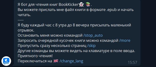 Суть проекта — бот будет «пинать» вашу книгу прямо к вам в telegram маленькими кусочками раз в час. Вы не заметите, как прочитаете книгу, которую откладывали в долгий ящик