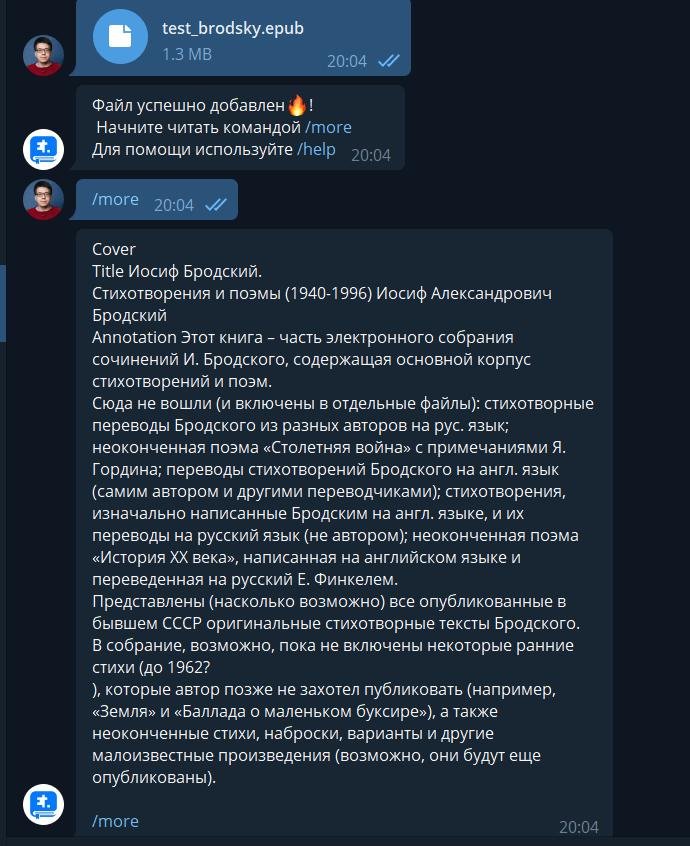 Вы можете прислать боту файл книги в формате .epub (пока поддерживается только такой формат) и начать читать свою любимую (или нелюбимую) книгу.