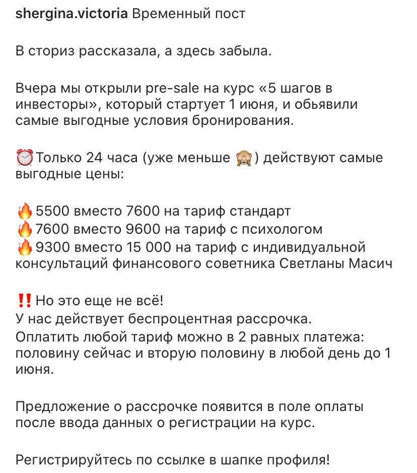 В Инстаграме часто используют кликбейты (кликабельный заголовок).Это когда так: Плюсы: Минусы: Уважайте читателей. Используйте кликбейты, но не злоупотребляйте. Грамотные заголовки должны отражать содержание текста: Должно быстро заинтересовать.Если введение будет длинным и состоять из «воды» — сразу провал.Пост не станут читать дальше. Заинтригуйте читателя 2-3 предложениями. Должна быть содержательной.Возможные вариации текста выделены в отдельный блок и описаны в пункте «виды постов». Это готовый вывод и призыв.У читателя не должно остаться недопонимания, он не должен гадать «так что в итоге делать-то?!». После прочтения поста у него должно быть понимание своих дальнейших действий. ◟Затем прочтите пост и удалите лишнюю информацию.Это называется «высушить» текст. Так он получится интереснее и легче. ◟Даже если у вас сложные юридические темы, подписчикам нужно доносить информацию легко. Можно даже в игровой форме. Инстаграм — это то место, куда пользователь приходить отдохнуть, а не работать. Если что-то можно понять неправильно, люди именно так и поймут. Поэтому перед публикацией дайте прочитать свой пост кому-то и уточните, что человек понял из поста. Пост должен вызывать эмоции.Не пишите монотонные тексты, читатель заскучает и отпишется.Чередуйте позитивные, негативные и полезные посты. А чтобы не попасть в бан, поддерживайте дружескую атмосферу и не нарушайте права человека. Теневой бан — это блокировка аккаунта. Он может длиться от нескольких часов до «навсегда». В теневой бан попадают за: спам, дискриминацию, оскорбления, нарушение закона РФ, очевидную эротику, прямое воровство контента, сцены насилия, нарушение лимитов. 1. Продающий пост в Инстаграм — основной вид для бизнес-профилей.Цель поста — продать товар/услугу. Самый простой путь создания продающего текста — использование формулы AIDA: ◟ Привлекаем внимание в заголовке.◟ Удерживаем интерес во введении и основной части.◟Там же вызываем желание купить.◟ А в заключении — побуждаем к действию.-Попробуйте сделать бонус, подарить промокод или снизить цену на несколько дней для стимулирования. Призывом могут быть фразы: подпишись; напиши в директ для приобретения товара; когда будешь листать сайт, загляни «сюда» и т.п. Очень важно знать, кто целевая аудитория.Посты нужно писать строго под потребности аудитории и на языке ее выгод. То есть описываем простыми словами и сленгом целевой аудитории плюсы товара, которые важны клиенту. Поймите боли, потребности и возражения своего клиента.Желательно писать согласно слогану «проблема-усугубление-решение». Проблема: Каждая уважающая себя девушка хочет иметь опрятный маникюр. Но найти поистине идеального мастера не так уж и легко. Предложений много, но нет гарантии, что результат вам действительно понравится. Усугубление: К тому же, давно всем известны плачевные результаты работ горе-мастеров. Из-за некомпетентности маникюрщицы вы столкнетесь не только с проблемой неопрятности маникюра, но и с травмами, порезами и что самое худшее — с инфекциями, которые впоследствии приведут к заболеваниям. Решение: После прочтения статьи вы узнаете основные пункты, на которые ни в коем случае нельзя закрывать глаза. На основе этого вы легко примете решение при выборе маникюрщицы (а дальше пишете сами пункты и готовый вывод). Еще од