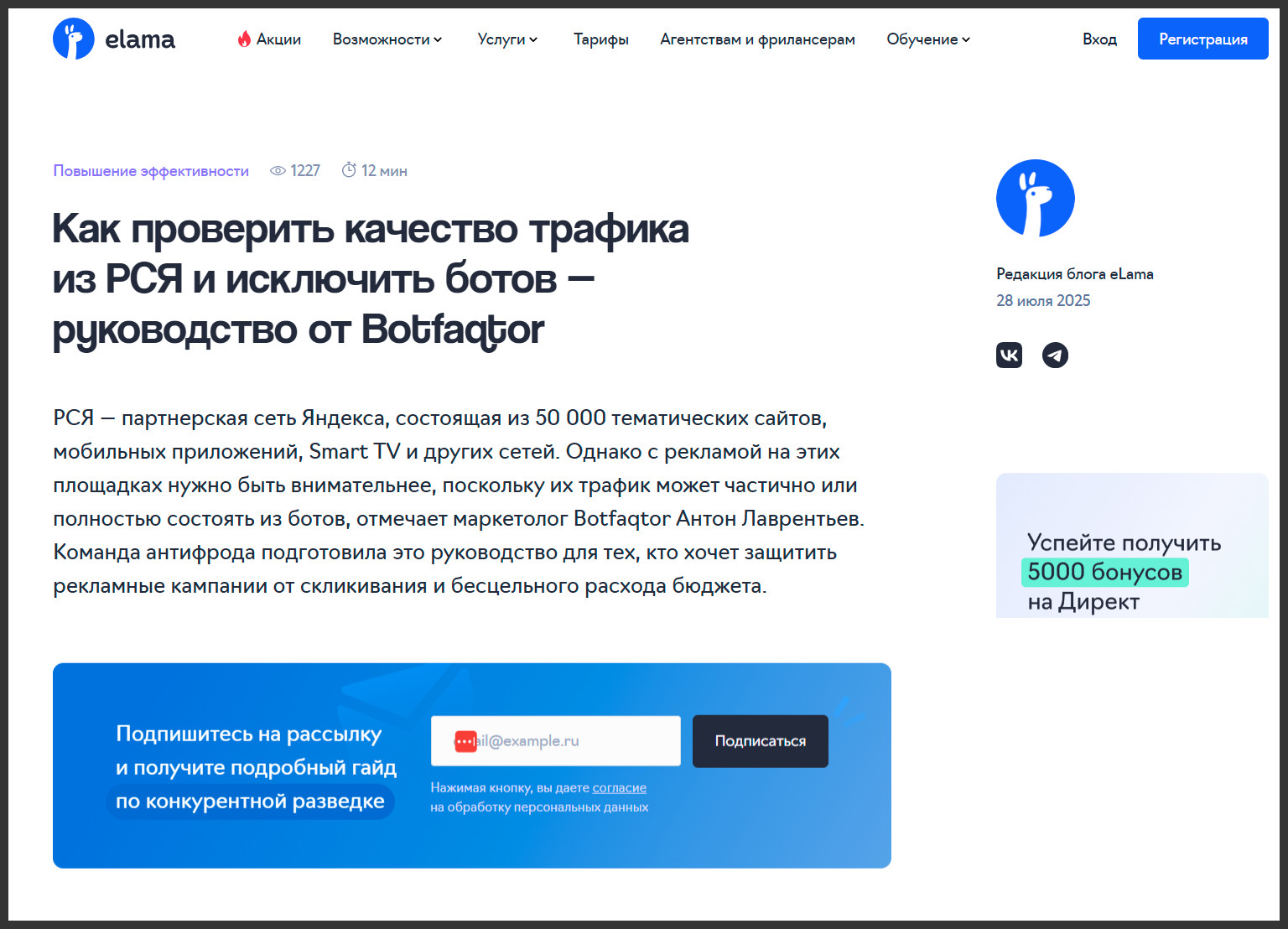 Это создание и распространение полезного контента для привлечения и удержания целевой аудитории. Через статьи можно заявить о себе как об экспертах в отрасли, показывать новые товары и услуги, делиться новостями и лайфхаками. Например, мы пишем о фроде и проверке качества трафика для eLama.