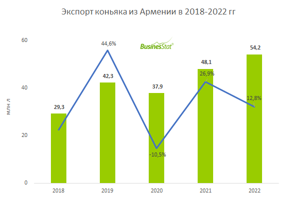 По данным «Анализа рынка коньяка в Армении», подготовленного BusinesStat в 2023 г, в 2018-2022 г его экспорт из страны вырос на 85,2%: с 29,3 до 54,2 млн л.