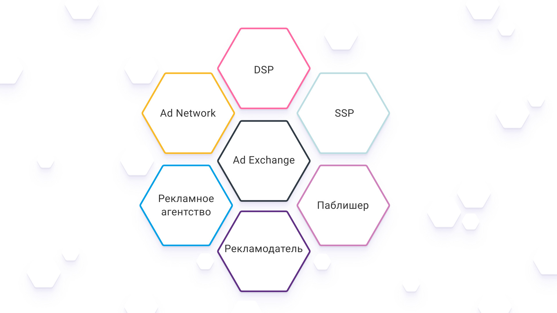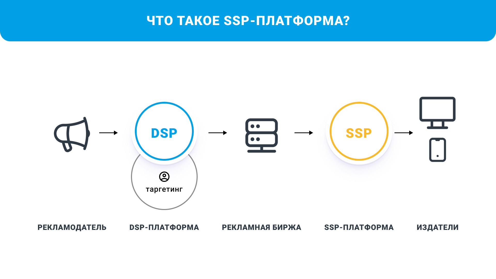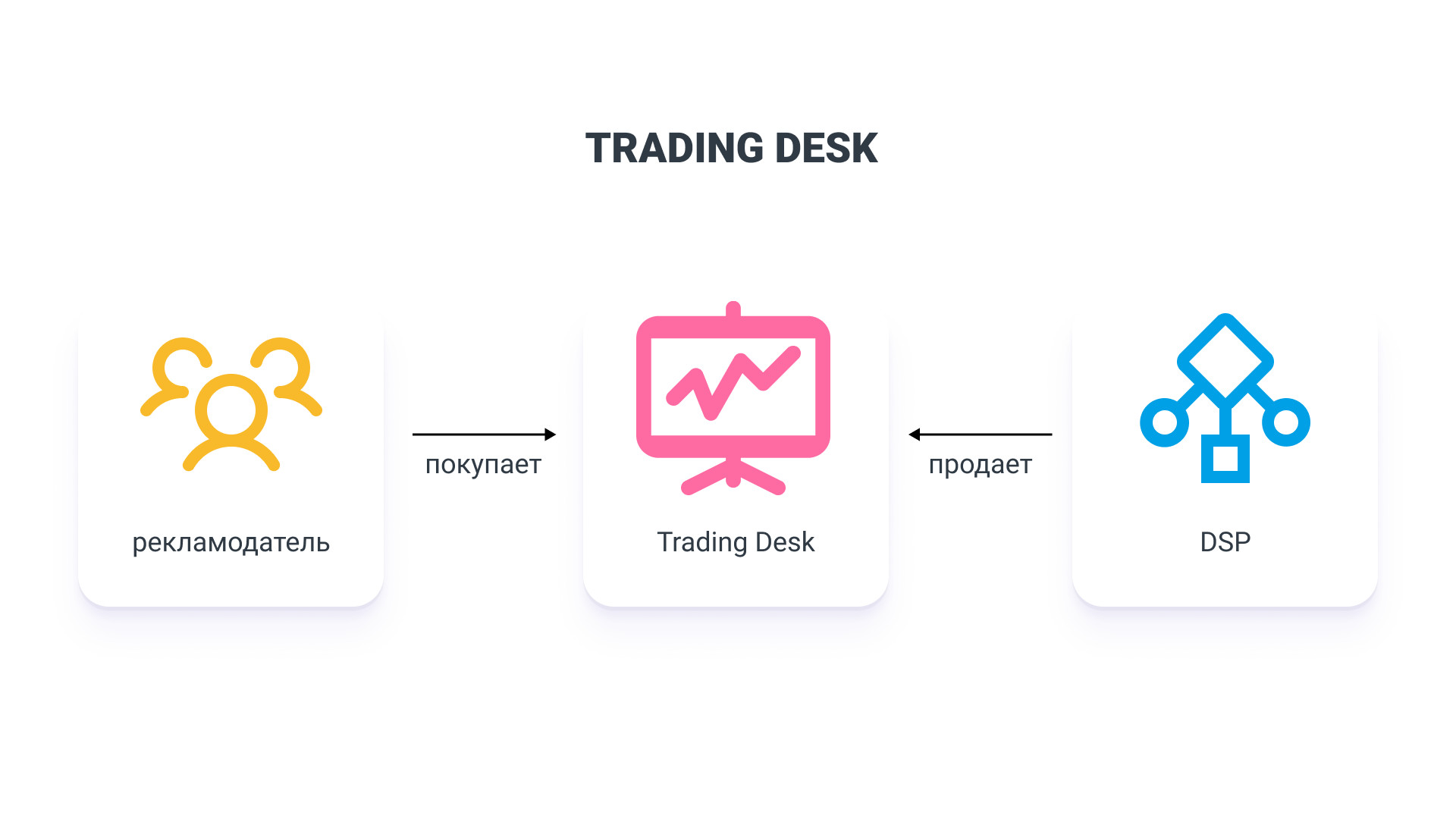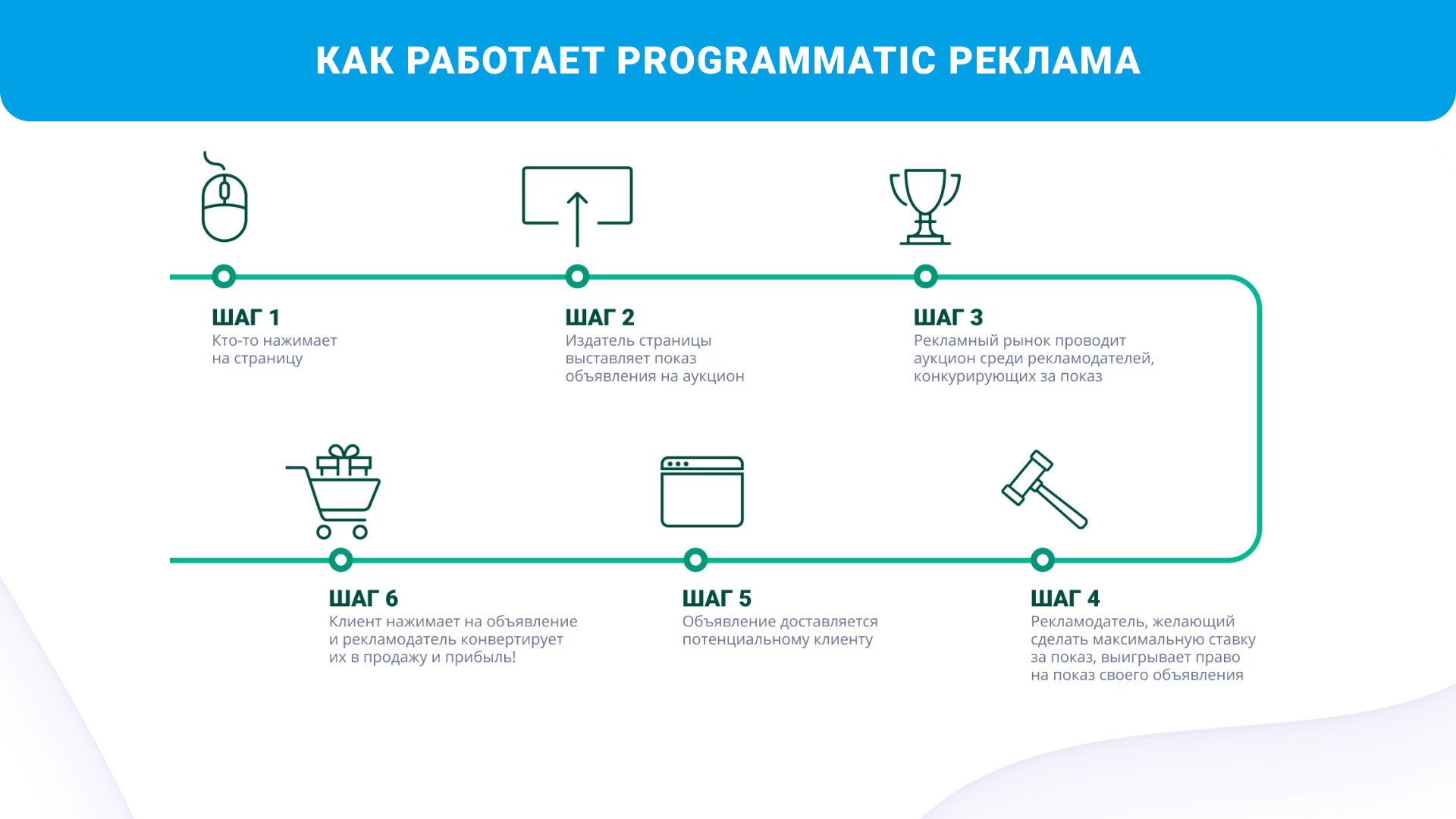 Автоматизация покупки рекламы и разнообразие данных о ЦА внутри программатик увеличивает эффективность всех рекламных кампаний. Programmatic media buying — покупка рекламных мест на различных каналах связи. Платформы автоматически находят нужных пользователей и показывают им рекламу. Рекламодатель может настроить кампанию так, чтобы объявления показывались только определенной аудитории. Каналы связи — это средства передачи информации между отправителем и получателем. Сюда входят разные виды технологий: Интернет, телефония, радио, телевидение и другие. Programmatic работает с медийными рекламными каналами. В них входит баннерная, социальная, мобильная, текстовая, текстово-графическая и видео реклама. У каждого канала есть свои особенности, которые учитываются в зависимости от целей РК. Например, баннерные форматы зачастую используются в дисплейной рекламе и служат в достижении имиджевых целей. Паблишер — это владелец сайта, приложения или другого канала коммуникации на котором размещается реклама. Рекламодатель может купить рекламу у паблишера через Programmatic, если тот подключен к специальным платформам. Подключение к платформам позволяет автоматически продавать рекламные места и получать деньги за каждое объявление. Имиджевые задачи направлены на формирование положительного образа компании и повышение престижа бренда. Формат размещения Programmatic рекламы нацелен в первую очередь на решение имиджевых задач бренда. Он мягко воздействует на пользователей, регулярно повторяя рекламное сообщение — это позволяет привлекать ЦА и увеличивать продажи. DSP (Demand-Side Platform) — это технологическая платформа, позволяющая рекламодателю автоматизировать процесс закупки рекламных площадок. На платформе DSP рекламодатель может определять параметры своей целевой аудитории, выбирать рекламные форматы и размещать объявления только на тех сайтах, которые соответствуют заданным критериям. По завершении рекламной кампании DSP предоставляет отчет о результативности проделанной работы. SSP (Supply-Side Platform) — платформа, с помощью которой издатели сайтов продают свой рекламный инвентарь. Рекламный инвентарь — весь объем свободного пространства, который доступен на ресурсе паблишера. Интеграция SSP с платформой DSP позволяет автоматически продавать рекламные места на аукционе в режиме реального времени. DMP (Data Management Platform) — платформа для управления данными. Она позволяет собирать, хранить и анализировать информацию о поведении пользователей в Интернете. DMP используется для оптимизации рекламных кампаний, так как знание целевой аудитории улучшает эффективность размещений. Ad Exchange — биржа рекламных мест, на которой происходит покупка и продажа рекламного инвентаря. Взаимодействие происходит на основе аукциона: издатели предлагают рекламный инвентарь, а рекламодатели делают ставки на покупку этого рекламного инвентаря. Платформа Ad Exchange полностью автоматизирована. В ходе процесса она принимает ставки от DSP, выбирает наиболее выгодное предложение и объявляет победителя. Trading desk — компания или отдел, который занимается покупкой рекламного инвентаря в режиме реального времени. Процесс происходит через Ad Exchange и другие платформы рекламного обмена. Trading desk использует данные полученные из DMP. Это позволяет оптимизировать покупку рекламы и достигать наилучших 