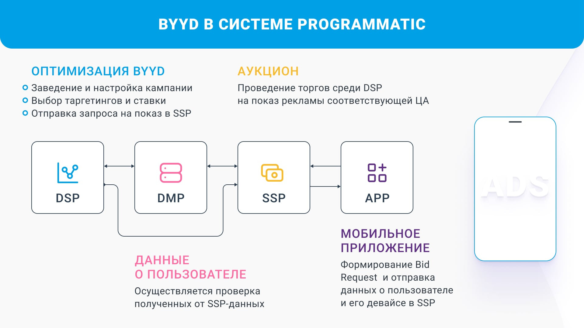 Приведем пример. Рекламу на билборде увидит много людей — дети, бабушки и автолюбители. Однако такой аудиторный разброс вреден рекламодателю, так как он не позволяет персонализировать рекламное предложение под конкретного человека. В программатик рекламе дела обстоят по-другому. Автоматическая закупка открывает доступ к широкому набору таргетингов. Это позволяет показывать рекламу исключительно заинтересованным пользователям. Так, если Вы продаете детские смеси, то в BYYD есть возможность таргетироваться на мобильные приложения соответствующих категорий. В частности, «родительство», «материнство», «воспитание» и другое. Если хотите изучить рынок программатической рекламы — читайте этот материал. Во-первых, высокая эффективность. До появления programmatic ad buying главную роль играл человеческий фактор. Раньше сделки осуществлялись непосредственно между покупателями и продавцами. В результате чего происходило удорожание итоговой стоимости и сбои в системе. Во-вторых, точность настроек таргетинга. Программатик позволяет точно попадать в целевую аудиторию. Система распознает нужную группу по соц-дем характеристикам, поведенческим данным, интересам, месту пребывания и другим критериям. В-третьих, удобство планирования. Гибкость программатик размещения позволяет создавать график показа рекламных сообщений. Таким образом, благодаря автоматизации можно делегировать публикацию рекламы специальным системам управления. В целом программатик баинг можно разделить на три этапа: • Подготовка включает в себя изучение конкурентов, выбор целевой аудитории и планирование бюджета. На этом этапе происходит сбор нужных для запуска кампании данных. Это важный шаг, так как он во многом он определяет успех будущего продвижения. • Запуск кампании происходит в заранее обозначенные сроки. Непосредственно сам процесс закупки инвентаря и его размещение происходит за доли секунды. На этом этапе важно отслеживать ход кампании и вносить корректировки по необходимости. Мобайл менеджеры BYYD оптимизируют мобильные рекламные кампании, ориентируясь на поведение пользователей. В ходе работы специалисты анализируют показатели отказов, длительность сеансов, расхождение кликов/сеансов и глубину просмотра. Бесспорно, в программатик процессе важно участие менеджера. Все потому, что оценить качество площадки автоматически не всегда возможно. К примеру, CTR высокий, но нет нужных поведенческих показателей. В таком случае требуется корректировка настроек и выбор других площадок. • Анализ — финальный этап программатик баинга. Здесь изучаются достигнутые показатели, а также составляются прогнозы на будущие кампании. На платформе BYYD можно провести Brand Lift исследование. Оно поможет оценить узнаваемость товара после проведенной мобильной кампании. Изучите наши Brand lift исследования и узнайте подробнее про этот процесс на нашем сайте. Программатик медиа баинг поддерживает имидж компании и привлекает новую аудиторию. Однако при этом он не вредит ключевым показателям эффективности. На платформе BYYD мы помогаем бизнесу доносить рекламное сообщение до целевой аудитории и решать различные имиджевые задачи. Если это то, что Вам нужно — пишите на почту hello@byyd.me. Было полезно? Тогда поделитесь с друзьями и коллегами! Для консультации и по вопросам сотрудничест
