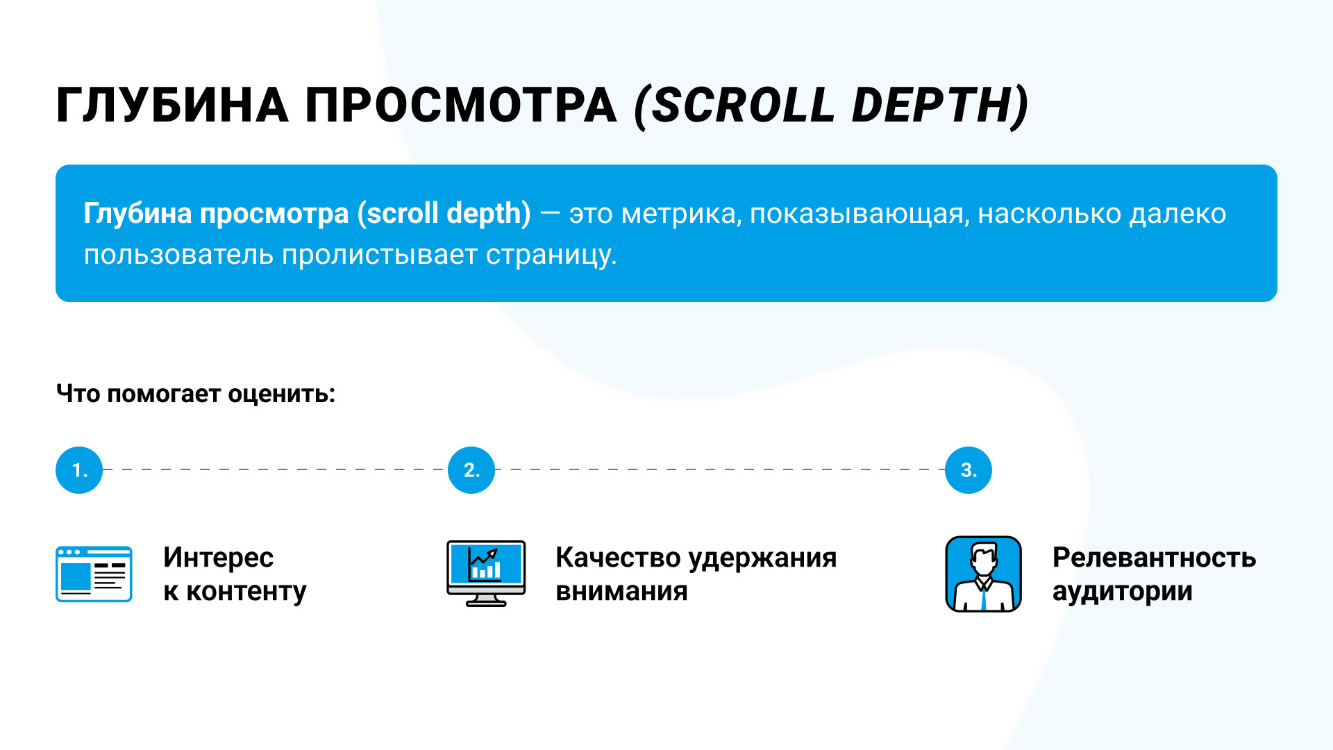 Глубина просмотра (scroll depth) — это метрика, которая показывает, насколько далеко пользователь пролистывает страницу во время визита.