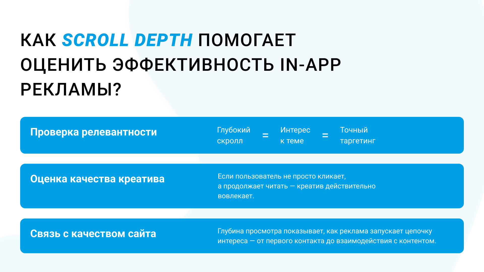 Если пользователь скроллит глубоко, значит, материал ему действительно интересен. Можно делать выводы о том, какие темы работают, а какие — нет.