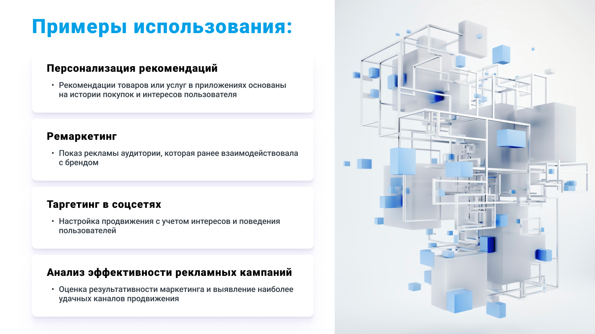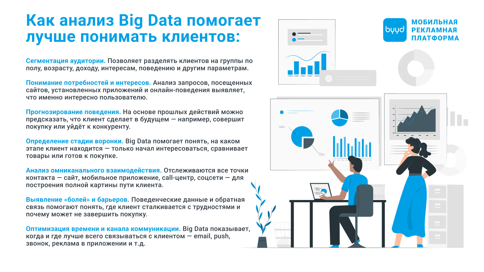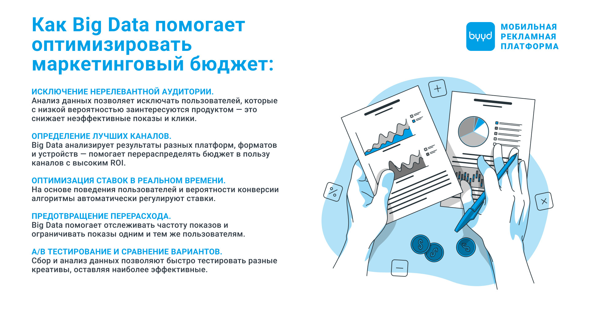 Эти данные объединяются, очищаются и используются для построения точных портретов аудитории, прогноза поведения и эффективного таргетинга. Согласно исследованию Ascend2, почти треть опрошенных (32%) считает маркетинговую стратегию, основанную на Big Data, очень успешной. 63% респондентов оценивают Data-driven marketing как умеренно эффективный инструмент. Это показывает, что у многих организаций есть значительный потенциал для улучшения и оптимизации аналитики больших данных. Опрос также показывает, что email-маркетинг (47%) и изучение клиентского пути (46%) — основные области, где маркетинг, основанный на данных, приносит наибольшую пользу. Эти результаты сохраняются третий год подряд и подчеркивают ключевую роль персонализированной коммуникации с потребителями. Big Data в маркетинге открывает новые возможности для взаимодействия с аудиторией. Big Data — инструмент, который помогает компаниям детальнее изучить аудиторию, выявить её потребности, интересы и поведение. Это позволяет провести сегментацию данных. Разделение аудитории на категории важно для создания более точных рекламных кампаний. Категории, которые можно выделить на основе анализа Big Data: Существует также предиктивная аналитика Big Data — анализ клиентских данных, который помогает предсказывать тренды и будущее поведение потребителей. Благодаря этому маркетологи могут формировать рекламные предложения заранее, ещё до того, как появляется видимый спрос. Реклама на основе данных позволяет отслеживать и анализировать поведение пользователей на разных платформах. Это даёт целостное представление о клиентском пути. В дополнение, Big Data — инструмент для оптимизации времени и канала коммуникации. Благодаря аналитике маркетологи узнают, когда и где лучше всего связываться с клиентом — email, push, звонок, реклама в приложении и т.д. Big Data в маркетинге помогает определить, на какой стадии воронки находится клиент. Например, он только начал интересоваться продуктом, сравнивает товары или готов к покупке. Если потребитель сомневается, поведенческие данные и обратная связь помогают понять, где возникают трудности. Таргетирование на основе данных позволяет показывать объявления только заинтересованным пользователям. Это улучшает результаты продвижения и ROI. Сочетание таргетинга и персонализации делает рекламные кампании более релевантными и эффективными. Это усиливает узнаваемость бренда, повышает лояльность клиентов и увеличивает доход. Как Big Data помогает в таргетинге: Благодаря Big Data мобильную рекламу можно настроить на сегменты аудитории, которые приносят наибольшую отдачу. Это позволяет сократить нецелевые расходы и увеличить ROI. Один из ключевых механизмов — снижение затрат на неэффективную рекламу. Анализ показывает, какие кампании приводят к конверсиям, а какие нет. Исключив или скорректировав малорезультативные каналы, маркетологи экономят бюджет и перенаправляют ресурсы туда, где они приносят прибыль. Кроме того, на основе поведения пользователей и вероятности конверсии алгоритмы автоматически регулируют ставки, чтобы увеличить конверсию. Big Data помогает предотвратить перерасход средств. Отслеживание частоты показов позволяет ограничивать показы одним и тем же пользователям. Программатик-реклама предлагает продвинутые методы таргетинга на базе Big Data. Это позволяет автома