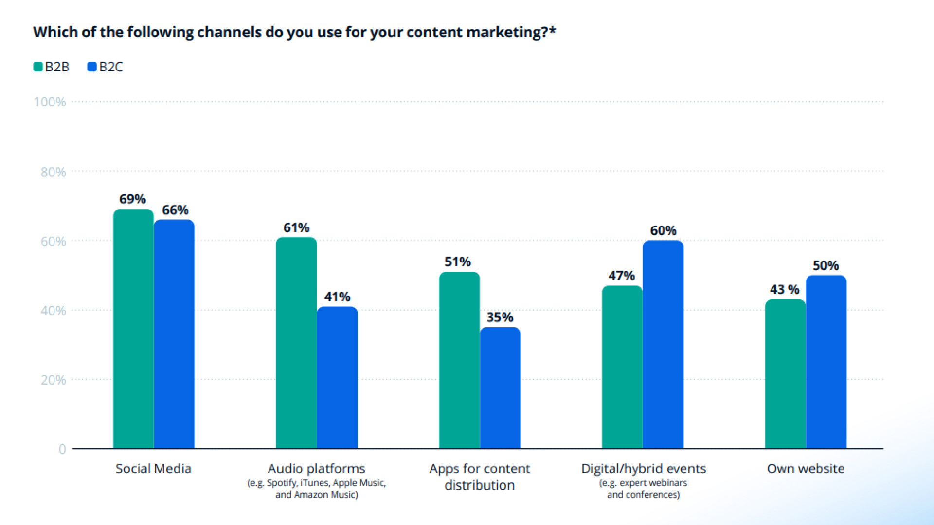 Надежность контента не возникает сама по себе. Это результат системной работы. Чтобы контент воспринимался как достоверный, B2B-компании применяют разные стратегии: социальные сети (69%), подкасты (61%), сайты компании (43%), онлайн-мероприятия (47%).