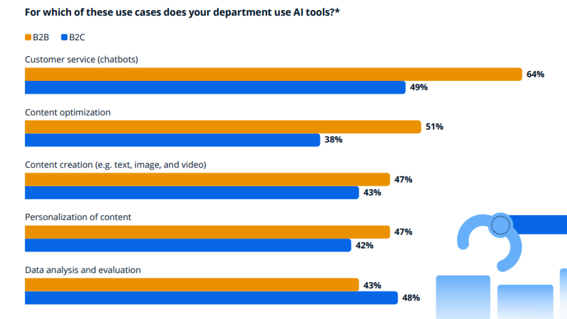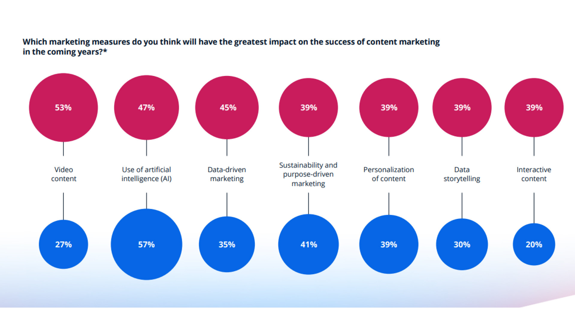 Мобильные приложения используют 51% B2B-компаний, что ставит их в тройку лучших каналов для распространения контента. 47% B2B-компаний используют дисплейную рекламу. Это графические объявления, которые показывают на сайтах, в мобильных приложениях и других цифровых платформах. Сырые данные формируют основу для аналитики, но их ценность определяет интерпретация и подача. В этом и состоит значимость data storytelling. 86% B2B-компаний уже используют этот подход и рассматривают его как мощный инструмент для вовлечения аудитории и позиционирования бренда. Data storytelling применяется в разных форматах: Сторителлинг на основе данных помогает брендам говорить яснее, глубже и релевантнее. Он превращает абстрактные факты в значимые истории и позволяет компаниям выделяться за счет экспертности. Однако одного доступа к данным недостаточно. Командам необходимо развивать аналитические навыки, а также улучшать подачу контента. Искусственный интеллект помогает на разных этапах работы над контентом: от планирования и создания до персонализации и анализа эффективности. ИИ играет двойную роль в контент-маркетинге: Наиболее распространенные сценарии применения ИИ в B2B-компаниях: ИИ помогает маркетинговым командам достигать большего с меньшими ресурсами. ChatGPT, Canva, Gemini — самые часто используемые инструменты в ежедневной работе маркетологов. Хотя ИИ помогает оптимизировать рабочие процессы, задач не становится меньше. По мере роста ожиданий и увеличения объемов контента, реализация становится не проще, а сложнее. Контент-маркетинг сегодня динамичнее, чем когда-либо. Но разрыв между амбициями и реальностью остается значительным. Один из главных вызовов — обеспечение достаточного объема качественного контента. Сложно сохранять стабильность без потери качества, особенно в условиях ограниченных ресурсов и быстрой смены приоритетов. Почти половина (47%) сталкивается с устаревшими или недостаточными инструментами. Это мешает эффективно выстраивать рабочий процесс и ограничивает масштабирование. Бюджетные ограничения — еще одна повторяющаяся проблема. 43% маркетологов жалуются на недостаток финансовой гибкости, чтобы справляться с растущими требованиями к контенту. Чего требует современный контент-маркетинг: По данным Statista, к главным тенденциям в сфере создания и продвижения контента относятся: Тренды контент-маркетинга в 2025 году сосредоточены вокруг инноваций и внимания к потребителю. Рекомендации от Statista: Было полезно? Тогда поделитесь с друзьями и коллегами! Для консультации и по вопросам сотрудничества: