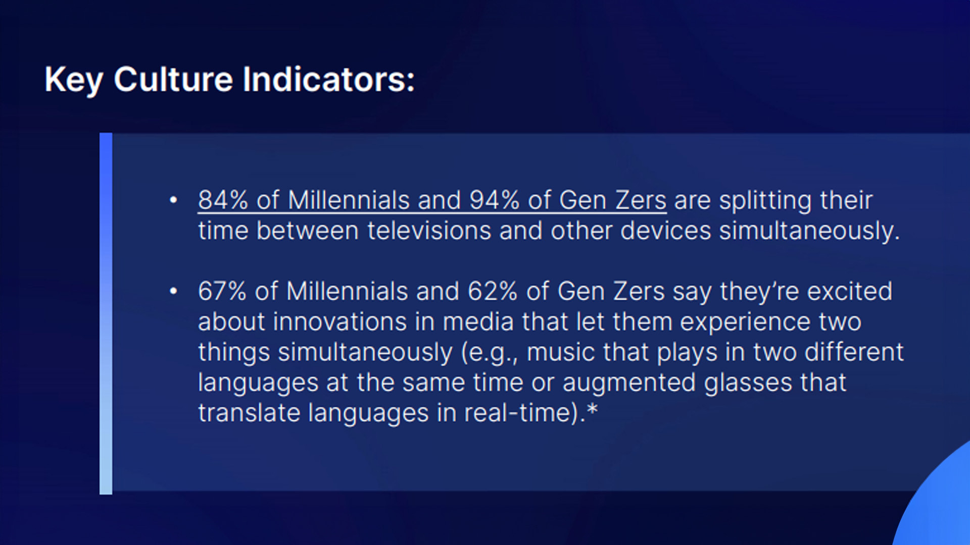 Технологии меняют тренды медиапотребления. Пользовательский опыт перестает быть линейным. Переплетение разных медиа-форматов помогает повысить уровень персонализации и заинтересовать юзеров. Например, в TikTok набирают популярность ролики, в которых блогеры исполняют песню одновременно на двух языках. Подобный контент может найти отклик у мультикультурной аудитории. Следуя этому тренду, мобильная платформа BYYD предлагает интерактивный формат Split Screen. Он делит экран на две отдельные зоны, каждая из которых показывает разный рекламный контент. Такой подход дольше удерживает внимание и стимулирует пользователей взаимодействовать с рекламой. Подробнее о формате читайте в статье.