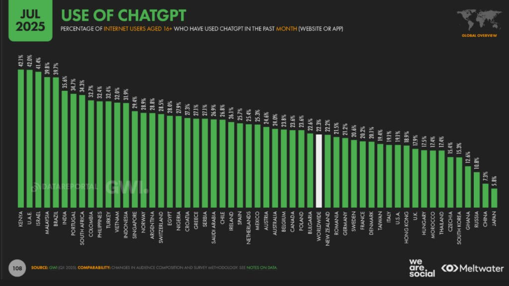 Интернет-аудитория выросла до 5,65 млрд человек — 68,7%. Число пользователей социальных сетей составляет 5,41 миллиарда. С июля 2024 года социальные платформы стали использовать 241 миллион новых пользователей. 97,5% населения мира используют смартфоны, 57,3% — компьютеры и ноутбуки, 33% — планшеты. В среднем пользователи проводят в Интернете 33 часа 42 минуты еженедельно. 95,9% выходят в сеть через мобильные телефоны, и только 60,7% — через ноутбуки и компьютеры. ТОП-10 стран с наибольшим числом Интернет-пользователей: Главные причины использования Интернета: По данным Statista , в 2024 году рекламодатели во всем мире потратили на поисковую рекламу более 316 миллиардов долларов США. Кроме того, поисковые системы остаются основным источником информации о новых брендах, продуктах и услугах. Они опережают телевизионную рекламу, продвижение в соцсетях и «сарафанное радио». Поэтому маркетологам важно понимать динамику поискового трафика и учитывать ее при выборе рекламной стратегии. За последние 20 лет поисковые системы, такие как Google, Bing и DuckDuckGo, стали отправной точкой для большинства действий в Интернете. Это во многом актуально и сегодня, но поведение и опыт онлайн-поиска меняются. Более 4 из 5 взрослых пользователей Интернета сообщают, что регулярно пользуются онлайн-поиском. Это ставит поисковые системы на третье место в списке самых популярных онлайн-ресурсов мира. Они уступают лишь мессенджерам и социальным сетям. С 1 марта по 31 мая 2025 года среднее количество посещений сайта Google.com составило 83 миллиарда в месяц, а среднее количество уникальных посетителей — 3,16 миллиарда. Тенденции цифрового маркетинга в мире меняются, и в последние месяцы наблюдается снижение поискового трафика. В начале 2021 года 84,1% взрослых пользователей Интернета пользовались поисковой системой в течение последнего месяца. В начале 2025 года этот показатель снизился до 80,6%. Вероятно, это связано с ростом популярности ИИ. Один только ChatGPT привлекает более 1 миллиарда посещений еженедельно. В среднем ChatGPT посещался более 5 миллиардов раз в месяц во втором квартале 2025 года. Флагманский домен OpenAI привлек в общей сложности более 16 миллиардов посещений в период с апреля по июнь. По последним данным, 22,3% взрослых пользователей Интернета в 54 крупнейших экономиках мира использовали ChatGPT в течение последнего месяца. Это указывает на активную пользовательскую базу из более 700 миллионов юзеров в месяц. Однако популярность ChatGPT различается по всему миру. Например, 4 из 10 пользователей Интернета в Кении, ОАЭ и Израиле использовали ChatGPT в течение последнего месяца. В июле 2025 года OpenAI уверенно лидирует в рейтинге лидеров в области ИИ, но это не единственная платформа, которая набирает обороты. Кроме нее, наиболее популярные платформы: Теперь люди тратят больше времени на просмотр онлайн-видеоконтента, чем на просмотр телевизора. Это подчеркивает, как изменилось поведение потребителей контента, а вместе с этим и тенденции цифрового маркетинга в мире. Пользователи тратят в среднем 11 часов 39 минут в неделю на просмотр онлайн-видеоконтента на таких платформах, как YouTube и TikTok. А на просмотр телевизора через эфирные и кабельные каналы — 10 часов 15 минут. При этом короткие видеоролики, такие как TikTok, занимают большую долю времени онлайн-видео, чем длинный видеоконтент, например, влоги. Юзеры тратят в средне