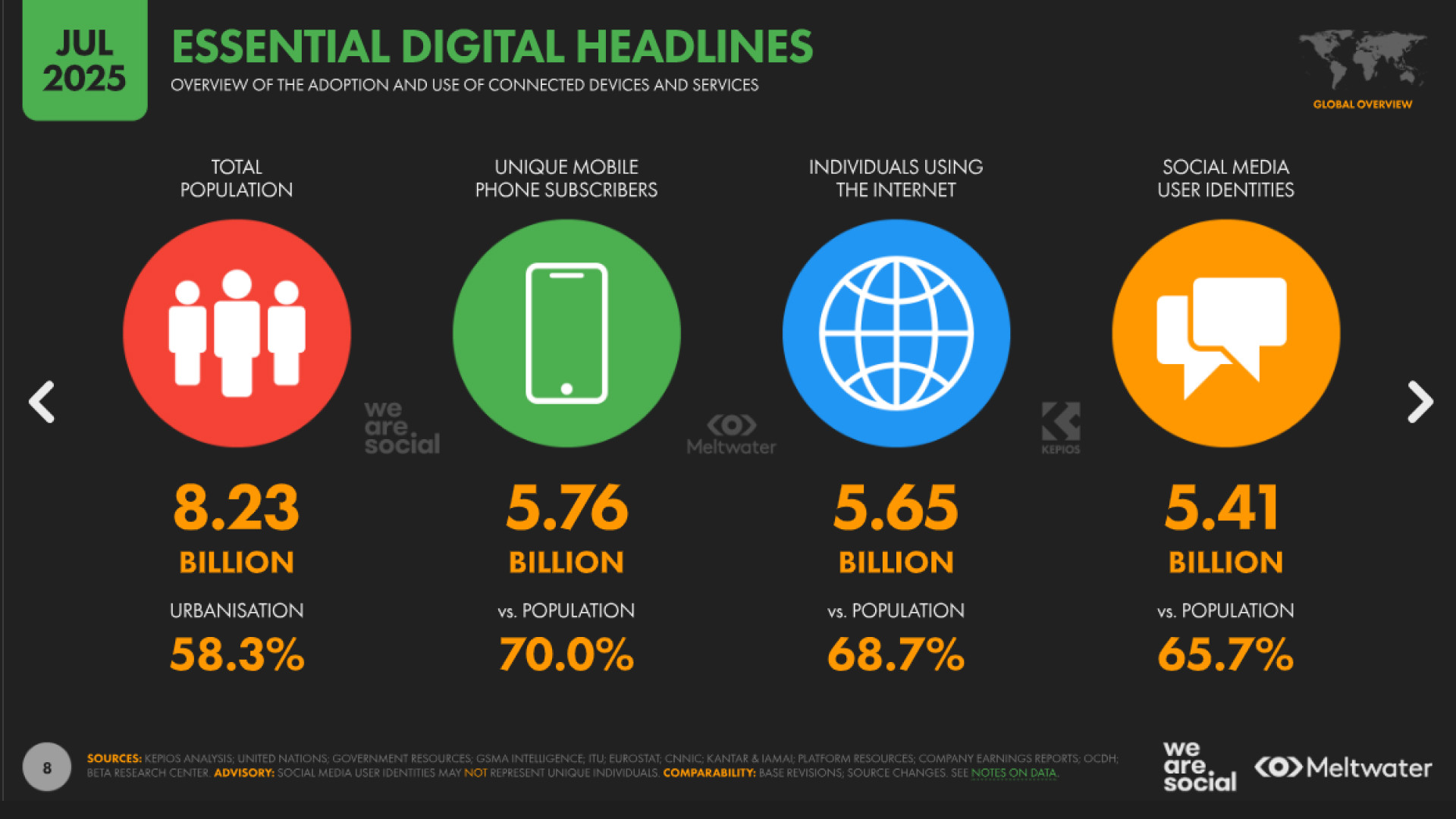 DataReportal в партнерстве с аналитическими платформами подготовили глобальный отчет Digital 2025 за июль, в котором отобразили тенденции цифрового маркетинга в мире. В нем собраны последние тренды в области Интернета, мобильных устройств, социальных сетей, ИИ, e-commerce.