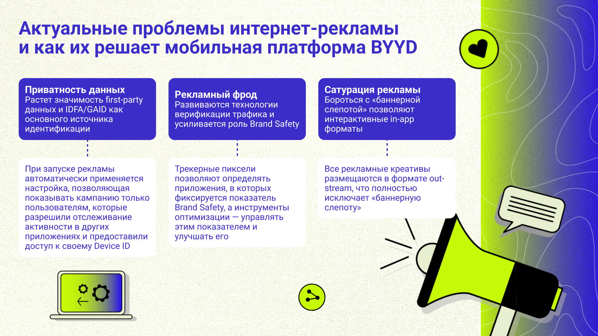 Развиваются технологии верификации трафика и усиливается роль Brand Safety. Согласно исследованию, 77% опрошенных рекламных агентств сталкивались с ботовым трафиком. Это вредит брендам и приводит к нецелевым заявкам. При этом мошенники отдают предпочтение тем сферам бизнеса, где потенциальный выигрыш больше. Среди них — финансы, телекоммуникации, недвижимость, образование. Опрос Аналитического Центра АРИР/АКАР/РАМУ показал, что для борьбы с этой проблемой 53% респондентов применяют антифрод-системы. В BYYD мы размещаем рекламу только в проверенных приложениях, прошедших модерацию в официальных сторах. Что мы делаем для чистоты трафика: — Показываем рекламу только устройствам с проверенной историей. — Проверяем IP через сервисы MaxMind и ip2location. — Требуем от SSP-партнеров наличия антифрод систем, таких как GeoEdge. — Постоянно совершенствуемся и развиваемся, поэтому мы разработали собственную антифрод-систему на основе искусственного интеллекта. Она анализирует рекламный трафик в режиме реального времени и выявляет недействительные запросы до участия в аукционе (pre-bid). Кроме того, для отслеживания качества трафика мобильная платформа BYYD использует трекеры: Подробнее о трекерах, которые мы применяем, читайте в статье. С ростом объемов интернет‑рекламы все больше пользователей сталкиваются с так называемой «баннерной слепотой» — психологическим феноменом, при котором человек сознательно или подсознательно игнорирует рекламные баннеры и элементы, напоминающие рекламу. Основные причины: В результате: традиционная display‑реклама все чаще дает низкую эффективность. Интерактивные форматы рекламы внутри мобильных приложений повышают вовлеченность пользователей. Во-первых, реклама выглядит как часть контента приложения, а не как чужой баннер. Это снижает ощущение «рекламного шума» и повышает восприимчивость. Во-вторых, разнообразие форматов отличает in-app рекламу от привычных баннеров и привлекает внимание. Согласно исследованию Nielsen, Rich Media баннеры чаще мотивируют пользователя перейти по ссылке на креативе для получения подробностей. В-третьих, в мобильном продвижении чаще использует данные о поведении, интересах и контексте пользователя. Это повышает вероятность, что объявление будет интересно именно ему. Современный цифровой маркетинг сталкивается с целым рядом вызовов — от баннерной слепоты до ужесточения требований к приватности данных. Чтобы сохранить эффективность кампаний, брендам необходимо адаптироваться к этим изменениям. Рекомендации по решению ключевых проблем: 1. Проблема: Баннерная слепота и низкая вовлечённость пользователей Решение: Использовать интерактивные in-app форматы (Rich Media, геймификация), которые привлекают внимание и формируют эмоциональный отклик. 2. Проблема: Рост фрода и некачественного трафика Решение: Применять многоуровневые антифрод-системы на базе ИИ и машинного обучения, а также использовать внешние верификаторы. 3. Проблема: Перенасыщение рекламой и снижение доверия аудитории Решение: Делать акцент на нативных, user-friendly форматах, которые не вызывают раздражения. 4. Проблема: Сложности с точным таргетингом и персонализацией Решение: Использовать поведенческие сигналы, интересы и контекстные данные внутри приложений, где пользователи дают наиболее прозрачный цифровой след. 5. Проблема: Неэфф