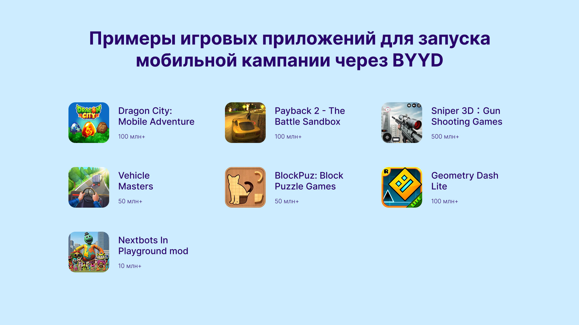 Для рекламодателей это означает: меньше случайных пользователей и выше прогнозируемая эффективность in-app размещений. Наблюдается смещение пользовательского спроса в сторону динамичных, соревновательных и социально ориентированных игр. Delta Force от Tencent утроила доходы от внутриигровых покупок в третьем квартале по сравнению со вторым, а Free Fire показала рост выручки на 22%, обогнав Call of Duty. Для мобильной рекламы этот тренд означает усиление роли shooter-аудитории как одной из самых ценных с точки зрения монетизации и вовлеченности. Пользователи таких игр проводят больше времени в приложениях, чаще взаимодействуют с контентом и позитивно воспринимают нативные и in-app форматы. В начале 2025 года видеоформаты заметно вытеснили изображения по доле показов в in-app рекламе. Однако уже во втором и третьем кварталах статичные баннеры начали постепенно восстанавливать позиции. Им стали уделять больше внимания. Статичные баннеры проще и быстрее в производстве, позволяют оперативно тестировать креативные гипотезы и находить наиболее эффективные концепции. Уже доказавшие свою результативность идеи затем масштабируются на более дорогие и сложные форматы — видео и интерактивные игровые размещения. Игровые рекламные форматы продолжают демонстрировать устойчивый рост показов. Их популярность объясняется способностью лучше фильтровать аудиторию по качеству посткликов. Такие форматы чаще привлекают заинтересованных пользователей и повышают эффективность рекламы. Royal Kingdom возглавляет рейтинг мобильных игр по расходам на рекламу в игровой индустрии США. Менее чем за год она стала 18-й крупнейшей игрой в мире по доходам от покупок внутри приложения. Второе место на рынке США заняла Candy Crush Saga, четвертое — Brawl Stars. Эти рейтинги важно учитывать при планировании мобильных кампаний, чтобы выбрать релевантные площадки для продвижения продукта через in-app. Мобайл-специалисты BYYD выбирают приложения для рекламы исходя из релевантных интересов целевой аудитории. При необходимости формируется White List, который содержит конкретные площадки для продвижения. Ежедневно в ходе кампании производится оптимизация по данным платформы и Яндекс Метрики клиента. Это позволяет исключить неэффективные приложения и улучшить результаты рекламы. Реклама в игровых приложениях стала одним из ключевых драйверов развития современного digital-маркетинга. Рост мобильного гейминга, высокая вовлеченность пользователей и активное использование внутриигровых покупок формируют уникальную среду, в которой бренды могут эффективно взаимодействовать с аудиторией. Во-первых, игровые приложения обеспечивают длительное и качественное внимание. Пользователи проводят в играх значительно больше времени по сравнению с другими категориями приложений. Это повышает запоминаемость рекламных сообщений и снижает эффект баннерной слепоты. Во-вторых, геймерская аудитория отличается подтвержденной платежеспособностью. Регулярные внутриигровые покупки и подписки формируют привычку к цифровым транзакциям, благодаря чему пользователи быстрее принимают решения о покупке рекламируемых продуктов и услуг. В-третьих, реклама в игровых приложениях стимулирует развитие креативных и интерактивных форматов. Видео, playable и rich media позволяют не просто показать продукт, а вовлечь пользователя в оп