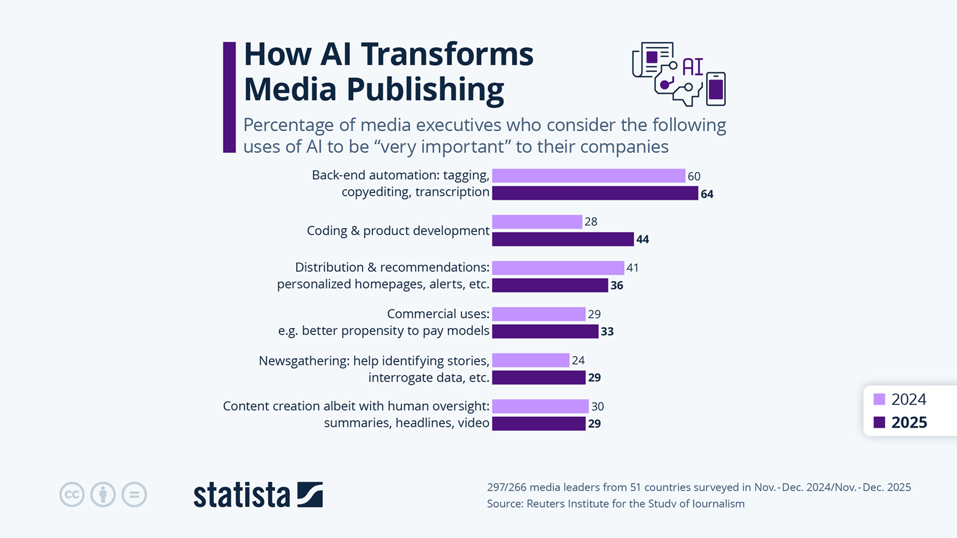 - Автоматизация бэкенда. ИИ широко применяется для автоматизации рутинных редакционных и технических задач — копирайтинг и редактура, транскрибация и управление метаданными.