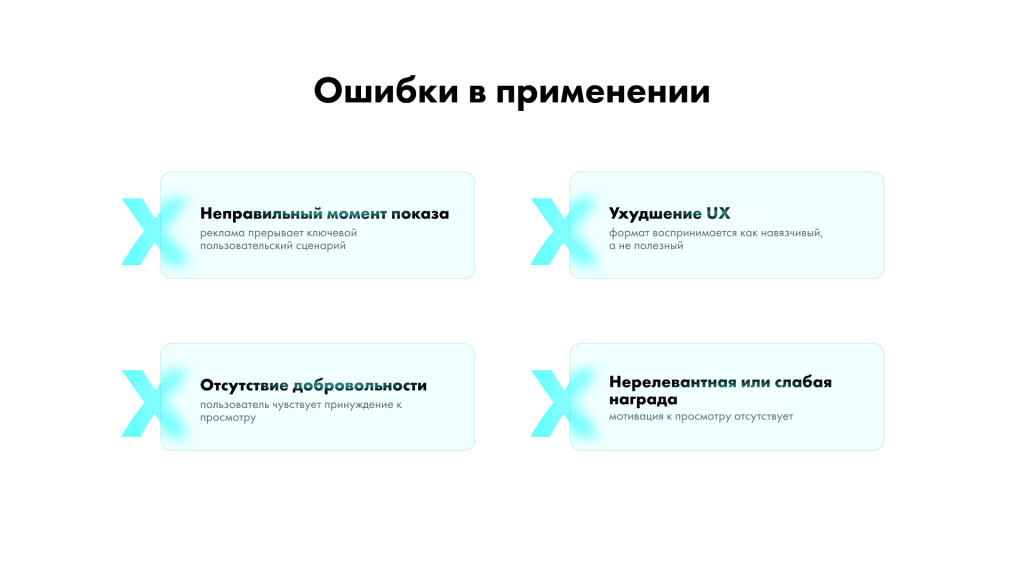 В отличие от навязчивых рекламных форматов, такое видео встроено в логику приложения или игры и воспринимается пользователем как честный обмен: время и внимание — за ценность. По данным TechCrunch, 68% игроков заявляют, что им нравится этот рекламный формат. Те, кто смотрит вознаграждаемую видеорекламу, в 6 раз чаще совершают покупки внутри приложения. По статистике Facebook Audience Network, игроки считают этот формат менее навязчивым: Эффективность формата связана с психологией выбора. Пользователь сам решает, смотреть рекламу или нет. Он заранее знает, какую награду получит. Это создает ощущение контроля и справедливости. Для пользователя реклама перестает быть помехой и превращается в инструмент достижения цели: Для разработчика это способ монетизации, который не разрушает пользовательский опыт, а наоборот — усиливает его. Кроме того, видеореклама с вознаграждением органично встраивается в экономику приложения. То есть награды можно балансировать так, чтобы они дополняли внутриигровые покупки, а не заменяли их. Видеореклама с наградами в неигровых приложениях работает эффективнее, чем многие ожидают. Механика «ценность в обмен на внимание» универсальна. Пользователь добровольно смотрит рекламу и получает понятную выгоду. Примеры пользы: Видеорекламу с наградами активно используют образовательные приложения с элементами геймификации. Например, в Duolingo пользователь может восстановить дополнительные «сердца» за просмотр рекламного ролика. «Сердца» ограничивают количество ошибок и помогают регулировать темп обучения. Бонусы за просмотр рекламы в данном случае позволяют продолжить занятия без паузы, а реклама воспринимается как добровольный обмен на ценность. Во-первых, обращайте внимание на место размещения вознаграждаемой видеорекламы. Например, показ ролика перед ключевым сюжетным поворотом в игре может его испортить. Эффективнее предлагать рекламу между уровнями или тогда, когда игроку не хватает жизней для продолжения. Во-вторых, учитывайте пользовательский опыт. Видеореклама с пользой помогает одновременно удовлетворять интересы рекламодателей и пользователей. Но этот формат не должен ухудшать UX. Наоборот, его задача — усиливать удовольствие от использования приложения. Это напрямую влияет на удержание и вовлеченность. В-третьих, видеореклама с наградой должна быть добровольной. Это влияет на конверсию. Тем, кто не планирует получать бонусы, нужна возможность спокойно пользоваться приложением. В-четвертых, предлагайте релевантную награду. Тестируйте варианты, чтобы найти наиболее актуальное предложение для пользователей. Слишком маленькое вознаграждение, скорее всего, проигнорируют. В мобильной рекламе существует множество креативных форматов, которые вовлекают пользователя через интерактив и нативный опыт. Это могут быть рич медиа баннеры с игровыми механиками, полноэкранные форматы, видео и другие решения. Подробнее читайте в статье. Команда BYYD более 11 лет работает с мобильной рекламой и создает баннеры, ориентированные на реальное вовлечение пользователей. Мы помогаем привлекать внимание аудитории и решать задачи клиента за счет проверенных механик. Чтобы узнать больше об in-app и познакомиться с кейсами платформы BYYD, переходите на сайт. Было полезно? Тогда поделитесь с друзьями и коллегами! Для консул