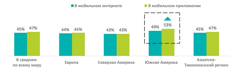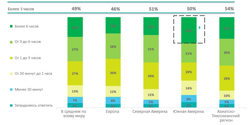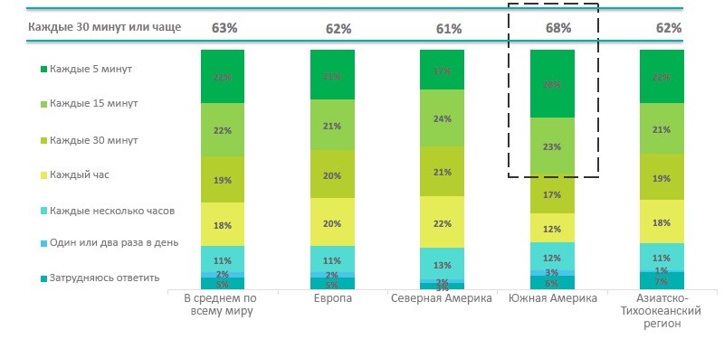 Исследование наглядно показывает высочайшую частоту использования мобильных устройств по всему миру. 63% опрошенных по крайней мере каждые 30 минут используют мобильное устройство, чтобы выйти в интернет, сделать звонок или просто проверить время; ну а 20% не могут обойтись без смартфона и 5 минут. Особенно сильно этот тренд выражен в Южной Америке: 29% респондентов оттуда проводят за использованием мобильного устройства не менее 6 часов в день. Настолько же активное пользование наблюдается в Китае (31%).