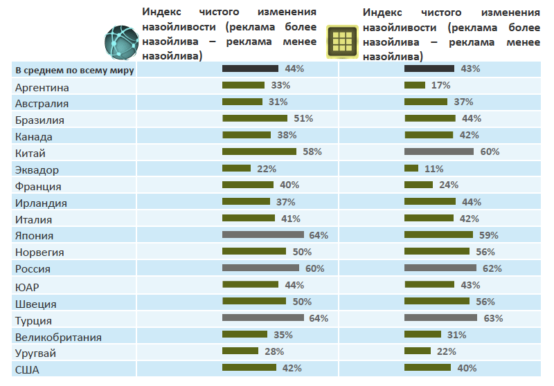 Индекс чистого изменения назойливости (реклама более назойлива – реклама менее назойлива)