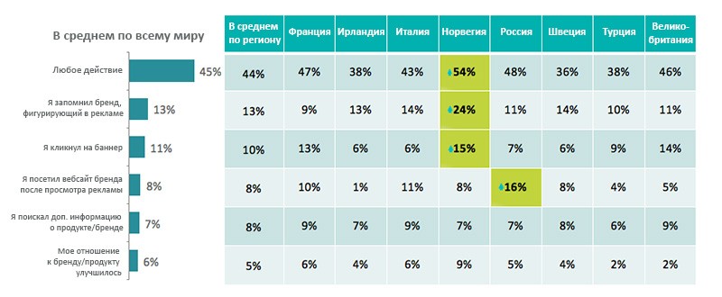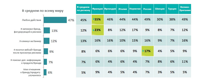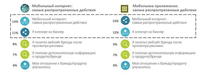 Отчет IAB также подчеркивает высокую эффективность мобильной рекламы. Подавляющее большинство опрошенных (88% и 84% для мобильного интернета и приложений, соответственно) ежедневно пользуются мобильным интернетом и/или приложениями и зачастую делают это много раз в день. Они также показывают высокую осведомленность о мобильной рекламе: практически все пользователи (90% для мобильного интернета, 86% для приложений) помнят, что видели ту или иную рекламу спустя несколько дней, а примерно половина пользователей совершила какие-либо действия после просмотра рекламы (так, в России пользователи чаще всего посещали сайт бренда).
