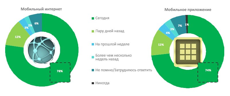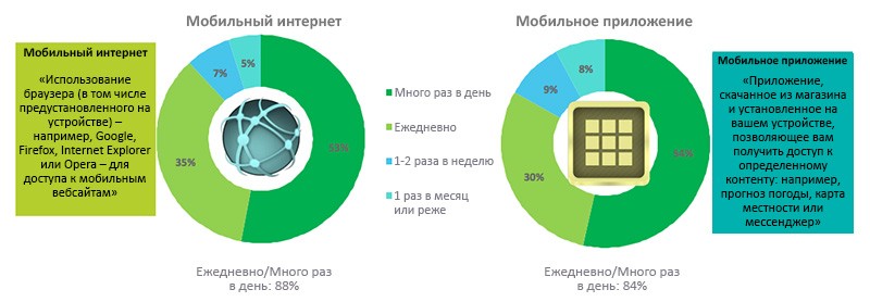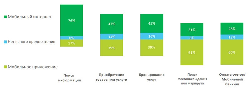 Наконец, еще одним вопросом, интересовавшим исследователей, был контент и виды деятельности, которые ассоциируются у пользователей либо с мобильным интернетом, либо с мобильными приложениями. Выяснилось, что в среднем респонденты посещают 6 мобильных вебсайтов и используют 6 мобильных приложений в день. При этом мобильный интернет обычно используется в бытовых целях (например, для поиска информации или совершения покупок), тогда как мобильные приложения более популярны как средство общения и развлечений (например, прослушивания музыки и просмотра видеороликов). Это разделение подчеркивается и типом контента, характерного для каждой из этих платформ: новости, работа, путешествия и образование ассоциируются у большинства пользователей с мобильным интернетом, а развлекательный контент – с мобильными приложениями.