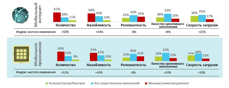 Опрошенные также отметили улучшения как в скорости загрузки, так и в креативном наполнении рекламных баннеров; наибольший прогресс в этой области был отмечен пользователями из Бразилии, России и ЮАР. В то же время, многие респонденты со всего мира пожаловались на возросшее количество и назойливость мобильной рекламы. Впрочем, пользователи из Франции и Бразилии отметили некоторые улучшения по части релевантности баннеров.