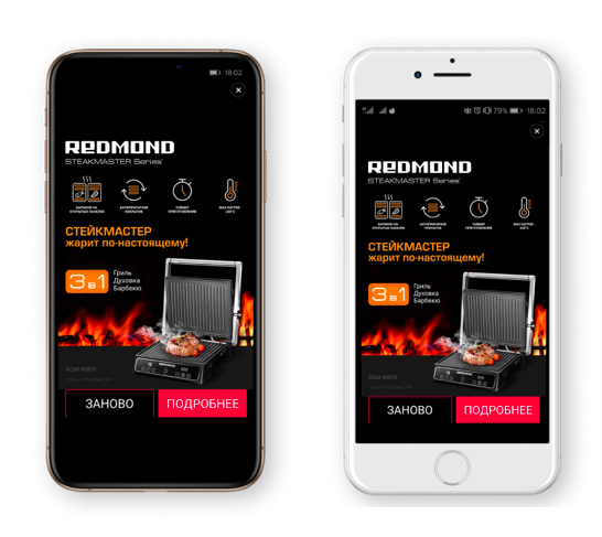 Первый пример — рекламная кампания гриля Redmond 3 в 1. Для того чтобы продемонстрировать преимущества бытового устройства и его возможности, мы разработали креатив в формате Rich Media и предложили пользователю «приготовить» три блюда на выбор: мясо, овощи или пирог. Таким образом ненавязчиво представили функции «3 в 1» и заинтересовали целевую аудиторию. Показы рекламы превысили 1,8 млн, а количество кликов — более 40 тыс.