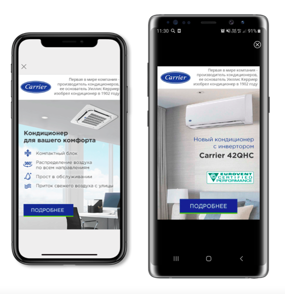Еще один пример — рекламная кампания, посвященная новинке в линейке пылесоса LG. В рекламном креативе (тоже динамический формат Rich Media) мы предлагали пользователям «начать уборку» с помощью пылесоса. Посмотрите, как это выглядело. В результате нам удалось охватить более 900 тыс. уникальных пользователей, в рамках рекламного периода план по показам был превышен (без увеличения бюджета) и достиг 2 000 974. Геймификация — не единственный способ креативной рекламы. Например, в рамках рекламной кампании по продвижению холодильника Midea и выгодных цен мы спроектировали рекламный креатив в формате Rich Media с механикой «стирание». Посыл «Заморозка выгодных цен» коррелирует с тематикой продукта. Пользователь должен был «протереть» запотевший экран, чтобы увидеть выгодное предложение. Благодаря оптимизации кампании мы превысили план по показам (фактическое значение — 1 400 504) и привлекли целевую аудиторию на сайт бренда (количество сеансов превысило 20 000). Правильная настройка таргетинга важна для того, чтобы привлечь целевую аудиторию. В рекламных кампаниях мы используем несколько параметров таргетинга: социально-демографические характеристики, интересы, география показа и другие. Так, например, в продвижении акционных товаров — соковыжималок Garlyn — мы настроили таргетинг не только по интересам «бытовая техника», но и смежным — тем, что связаны непосредственно со спецификой продукта: еда и напитки, кулинария, выпечка, приготовление низкокалорийной пищи, приготовление изысканной пищи, здоровое и низкокалорийное питание. По результатам рекламной кампании удалось достичь нужных показателей — хорошего времени на сайте, которое в два раза превысило средний показатель по мобильной рекламе, низкого показателя отказов и охвата более 220 тыс. пользователей. Если в процессе рекламной кампании продвигается несколько продуктов, правильная тактика — разделить рекламные креативы и настроить таргетинг так, чтобы предлагать продукт, нужный конкретной целевой аудитории. Учитывая этот факт, мы разрабатывали рекламную кампанию для продвижения кондиционеров Carrier. Кампания была разделена на несколько этапов и длилась три месяца. Для первого этапа мы создали рекламный креатив Rich Media и применили погодный таргетинг — в соответствии с текущей температурой региона показывали рекламный креатив для теплой и холодной погоды. А на втором этапе разработали баннеры в формате FullScreen для каждого продукта отдельно: кондиционер для дома и офиса. И для попадания в нужную целевую аудиторию применили таргетинг по релевантным интересам разных сегментов аудитории: бытовая техника, строительные работы, ремонт и недвижимость — и бизнес, изучение бизнеса, ПО для бизнеса. Пользователи увидели рекламу более 1,7 млн раз. Мобильная реклама помогает охватить целевую аудиторию и повысить узнаваемость бренда и продукта, привлечь пользователей на сайт и решить другие цели. Важно только правильно подойти к разработке креатива, учитывать специфику продукта и компании. За этим можно обращаться к нам!