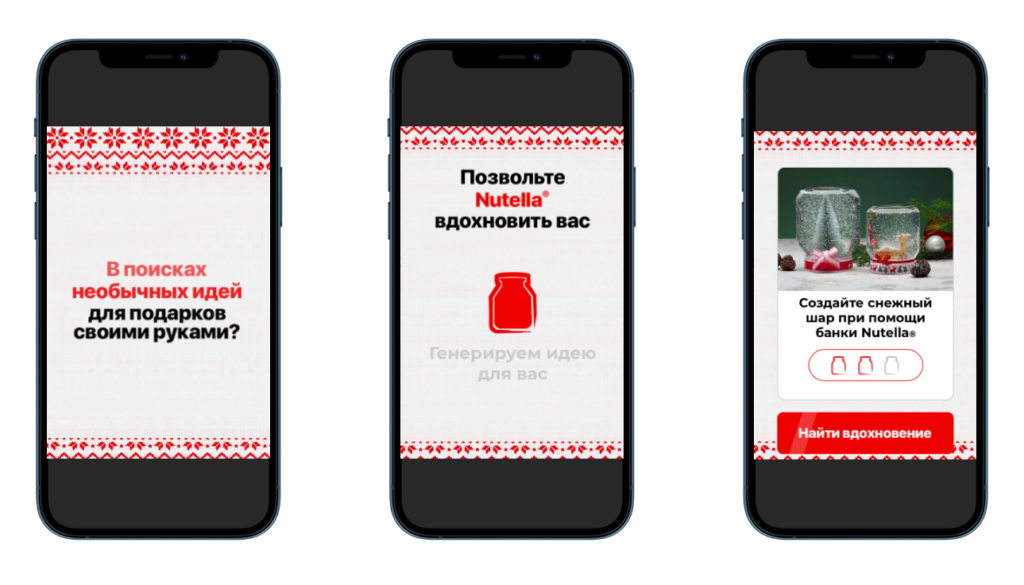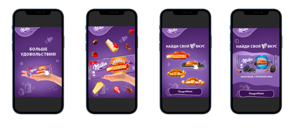 Мотивировать пользователя взаимодействовать с рекламой непросто — и это еще сложнее, если выбрать рекламный креатив в формате статичного баннера и даже популярный видеоформат. С механикой взаимодействия Rich Media этот вопрос решается — пользователь вовлечен в процесс, он с большей вероятностью кликнет на CTA и перейдет на сайт клиента. Например, как в этом рекламном креативе для Milka. Взаимодействие происходит дважды — сначала пользователю предлагают нажать на плитку шоколада, а затем — выбрать свой вкус. Продемонстрировать результаты после использования рекламируемой услуги за несколько секунд — это возможно с помощью механики До/После. Такая механика будет актуальна и для услуги в сфере бьюти-индустрии — как здесь. Но не только. В креативе для Raffaello мы тоже применили такую механику — пользователь мог превратить обычную коробку конфет — в коробку из лимитированной коллекции малинового Rafaello. Протри экран — такая механика тоже работает! Можно задействовать ее по-разному — сначала «скрывать» креатив и предлагать пользователю посмотреть его, протерев экран. Иногда это очень удачно совпадает с тематикой продукта — например, в рамках продвижения холодильников Mideaмы сделали креатив с «запотевшим» экраном. В других случаях механика «протри» может работать для демонстрации преимущества продукта. Например, как в креативе «Полисорб», где пользователь мог «протереть» экран, чтобы увидеть действие продукта. Анимация в виде книги позволяет в одном креативе рассказать о нескольких продуктах или услугах. Как, например, здесь — для туристического агентства разработан креатив, где на манер книжных страниц пролистываются направления для путешествия. На каждой «странице» — CTA-кнопка, чтобы пользователь сразу мог перейти к целевому действию. Эта механика также помогает продемонстрировать в одном креативе разные свойства продукта или разные типы товара. По сути, слайдер может совмещаться с другими механиками: анимацией, взаимодействием. Как, например, в этом рекламном креативе — сначала пользователю предлагаем выбрать любимый вкус печенья, а потом пролистать описание других. Пользователь может сам выбирать, что ему интереснее в рамках одной рекламы — с помощью меню. Эта механика тоже часто совмещается с другими — тем же слайдером. Например, здесь пользователю предложено выбрать направление на карте Тайланда — и затем прочитать подробнее об отличительных особенностях региона. Реализация этой механики зависит от тематики продукта. Например, для новогоднего рекламного креатива Nutella выбрали тему подарков своими руками и рандомно генерировали отображение разных идей, которые можно реализовать, используя продукт. Геймификация — одна из самых популярных механик вовлечения пользователя в рекламный процесс. Играть любят все — не только подростки. Подать игру можно по-разному. Например, в рамках кампании по продвижению языковой школы мы разработали Rich Media креатив, где персонажу нужно было помочь с выбором — ответив на его вопросы на английском, и таким образом «довести» до цели. Пользователь может «играть» и другим образом. Например, следовать за героем виртуальной игрыи помогать ему победить монстра с помощью продукта клиента (энергетического напитка, как в этом случае). В рамках игры есть несколько разных механик, одна из них 