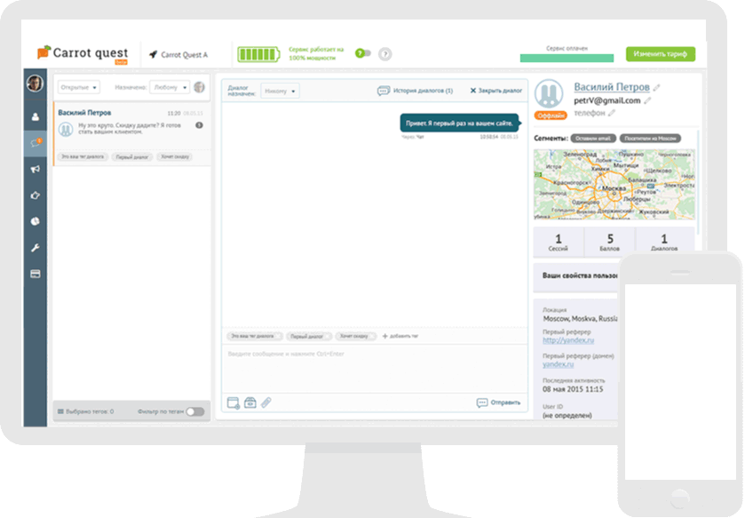 Для тех, кто с самим сервисом еще не знаком, Carrot Quest — это сервис, который собирает ключевую информацию о каждом посетителе вашего сайта и на основе нее помогает довести пользователя до покупки, как вручную, так и автоматически. Онлайн-чат — это только верхушка айсберга в нем.