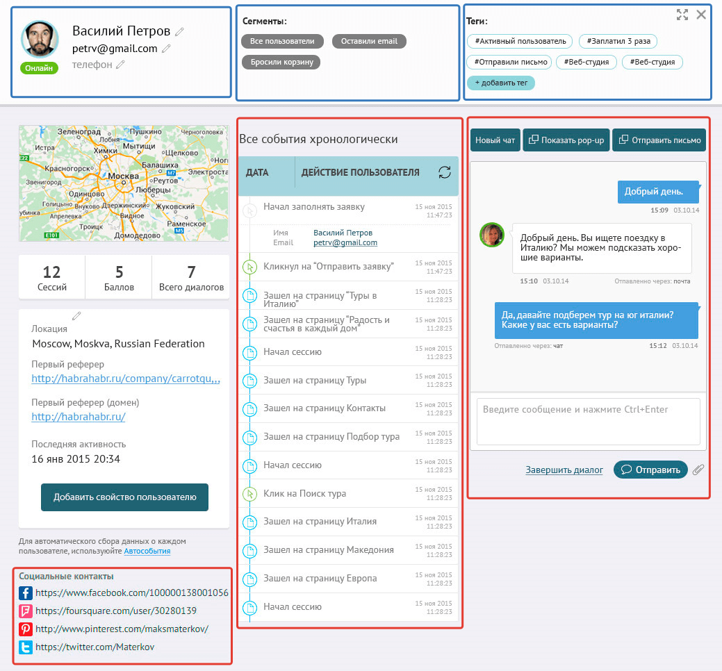 Ключевой момент: Сбор и хранение данных о пользователе дает наиболее полные и быстрые ответы на любые вопросы. Если вы знаете, откуда пришел пользователь, что именно делал на сайте, какие вопросы уже задавал, какие страницы смотрел, то помочь ему будет намного проще и никаких лишних вопросов от оператора не потребуется.