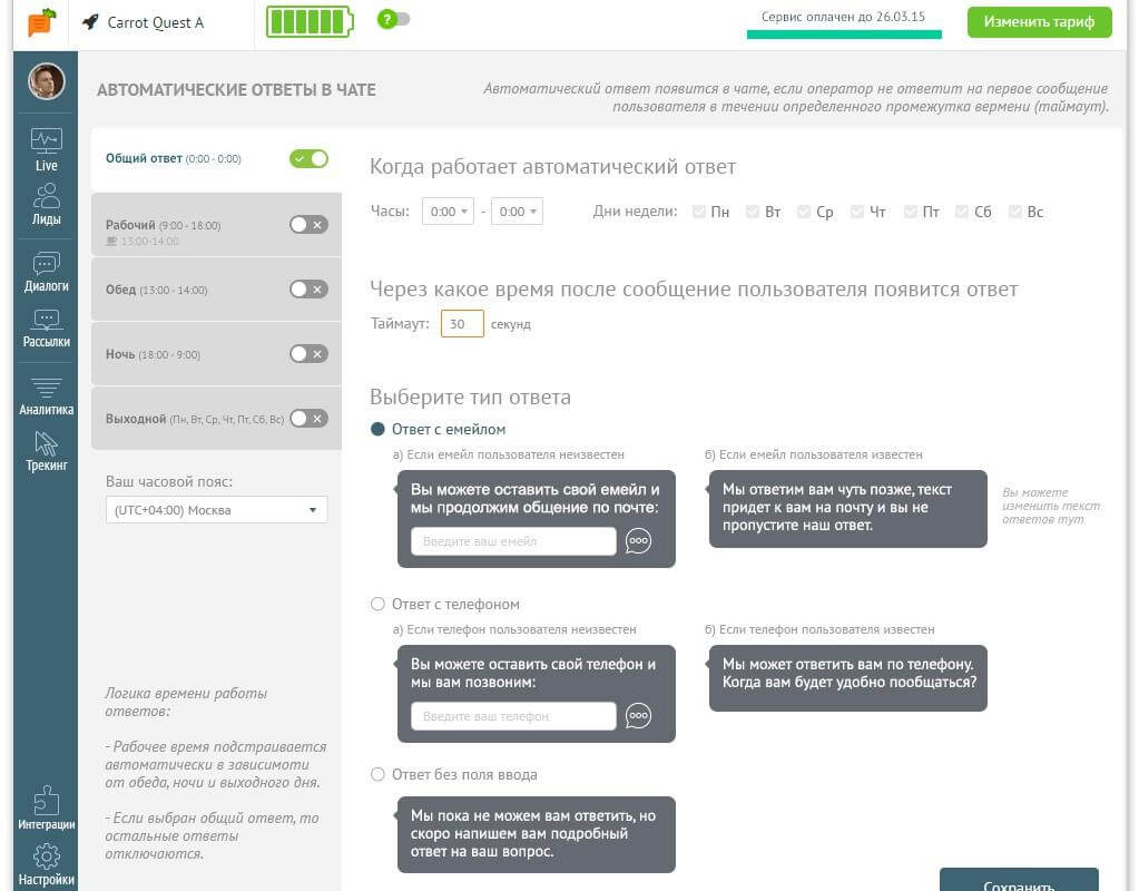 С помощью Carrot Quest можно отправить разным сегментам пользователей автосообщение, в котором будет предложено оставить свою электронную почту и продолжить общение прямо из нее. Независимо от решения посетителя ответ гарантирован, и он будет отправлен самым удобным для клиента способом (он может посмотреть ответ в почте или позже просто вернуться на сайт и открыть чат, где его уже будет ждать ваш ответ).