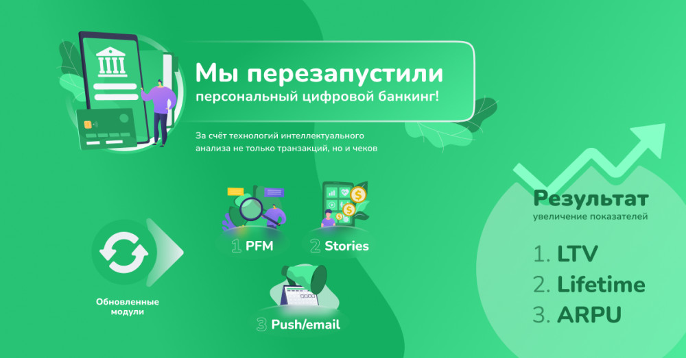 Для решения этой проблемы в банки был с успехом внедрён наш сервис аналитики данных. У банка появилась возможность иметь полное представление об интересах и потребностях клиента. За счёт технологий интеллектуального анализа транзакций и чеков сервис позволил банкам точно профилировать пользователей и предоставлять персональные рекомендации.
